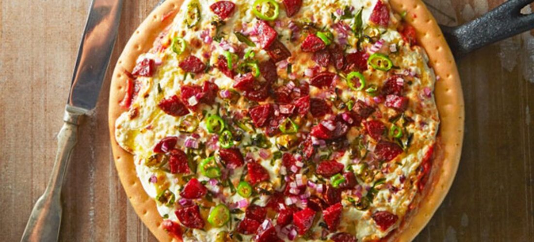Deliciosa pizza a la mexicana con queso, chorizo, cebolla y jalapeño