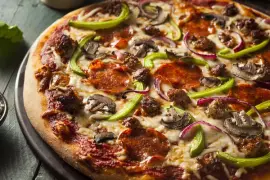Deliciosa pizza suprema con queso, pepperoni, cebolla, champiñones, salchicha y pimiento morrón.