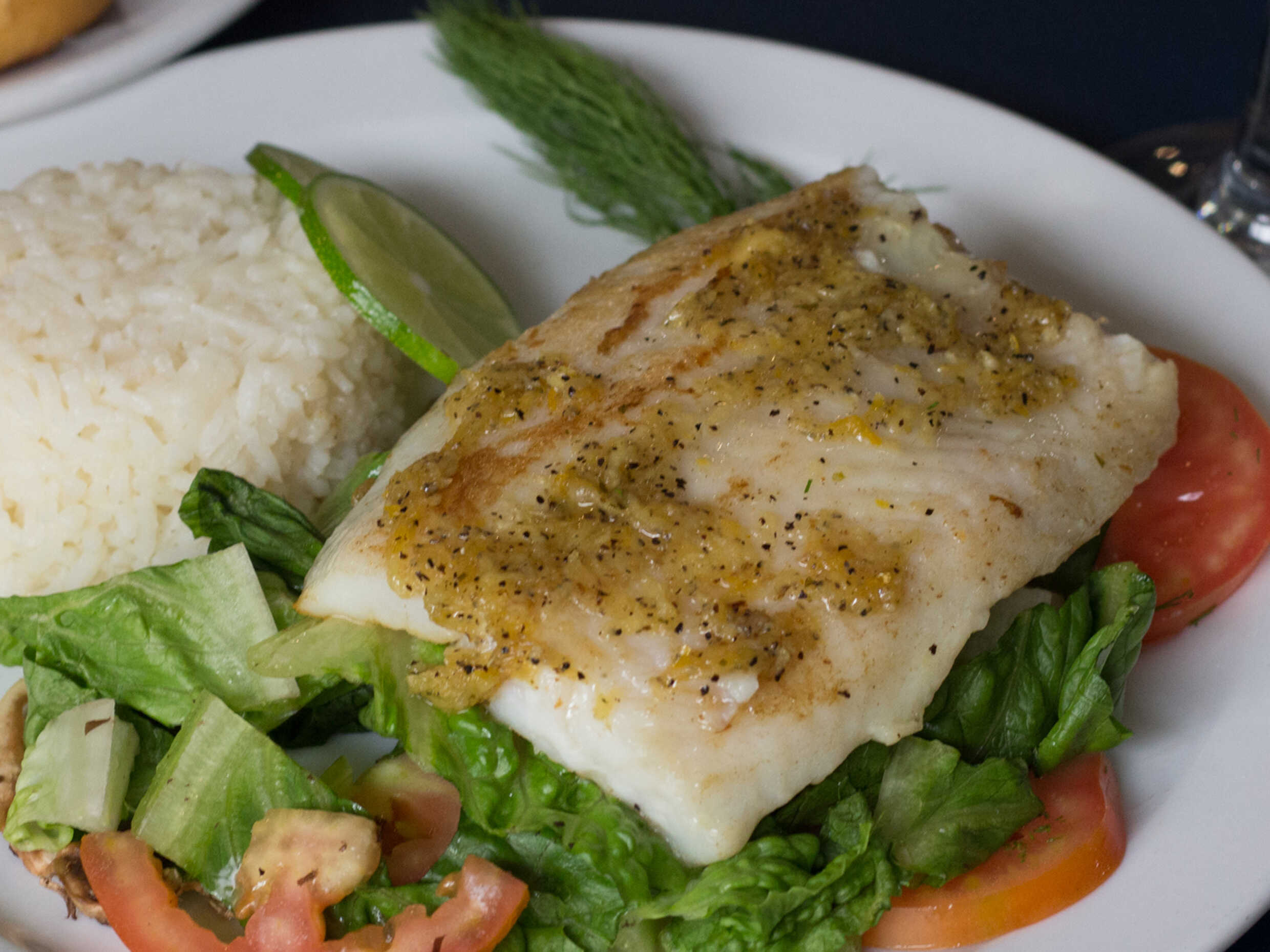 Marinado cítrico, con un toque de jengibre y ajo, montado sobre lechugas, champiñón y tomate. Servido con arroz. Acompañado de botana de ceviche, consomé, 1 tostada, 1 paquete de galletas saladas, 1 pza de pan de la casa, salsa y limones.