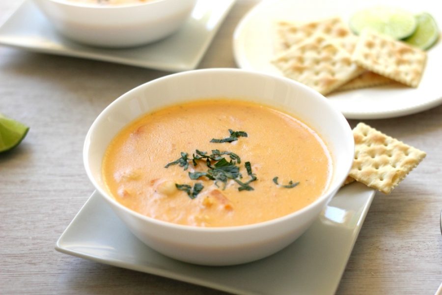 Crema con un toque de paprika y tocino. Platillo acompañado de botana de ceviche, consomé de mariscos arroz y ensalada.
