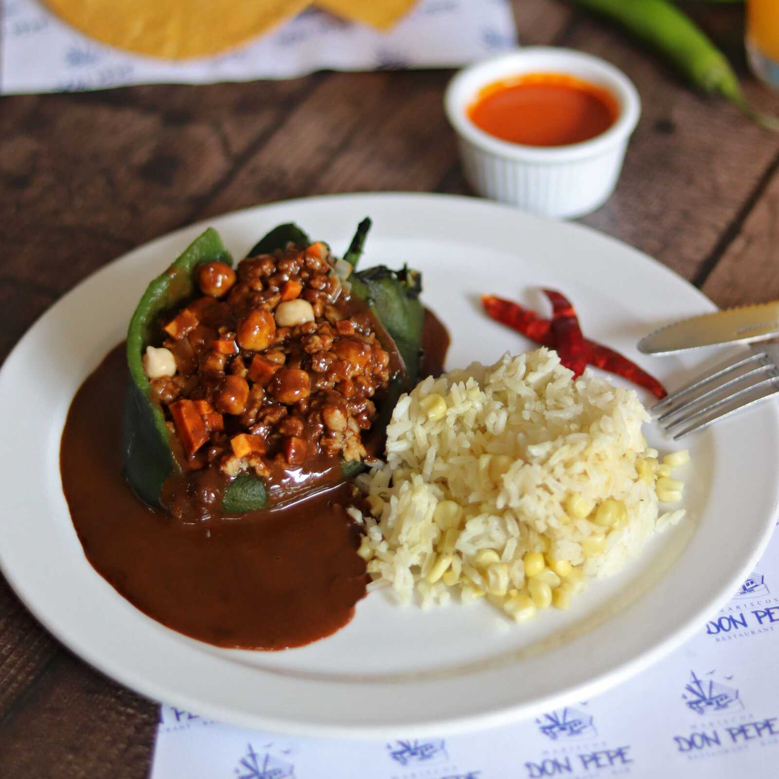 Relleno de camarón y queso. Acompañado de botana de ceviche, consomé de mariscos, platillo acompañado de arroz y ensalada verde.