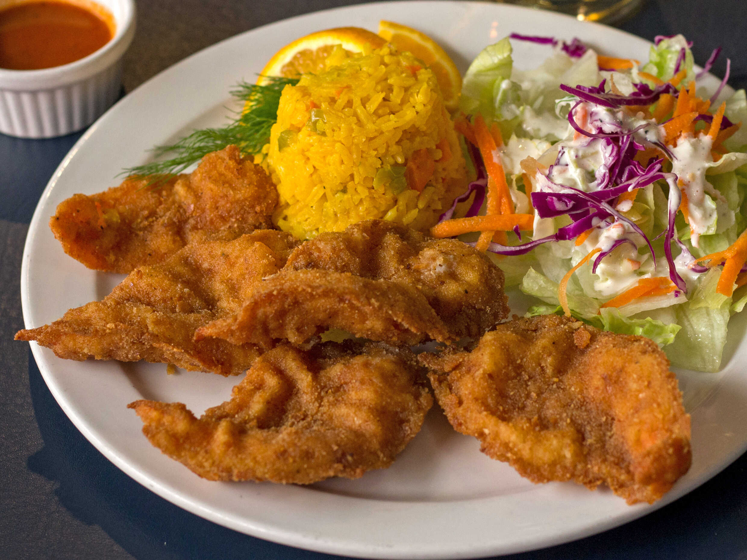 Orden de calamares empanizados acompañados de salsa tártara.