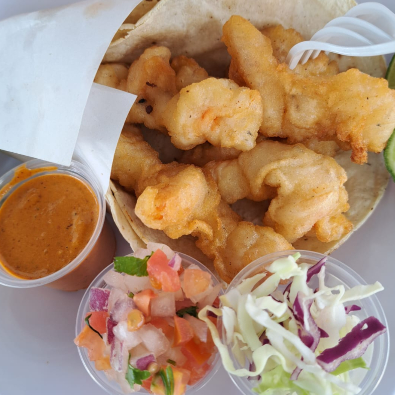 Taco de camaron capeado en tortilla de maiz, acompañado de salsa mexicana (tomate, cilantro, cebolla) repollo y crema.