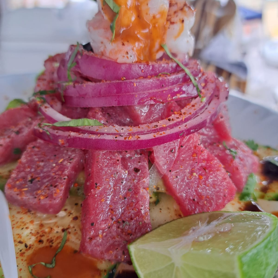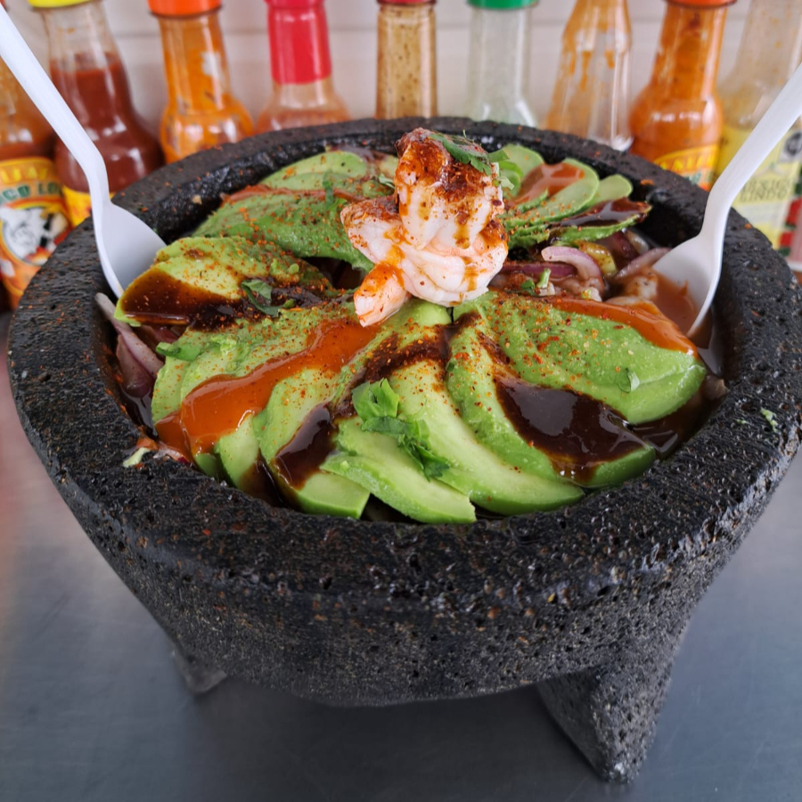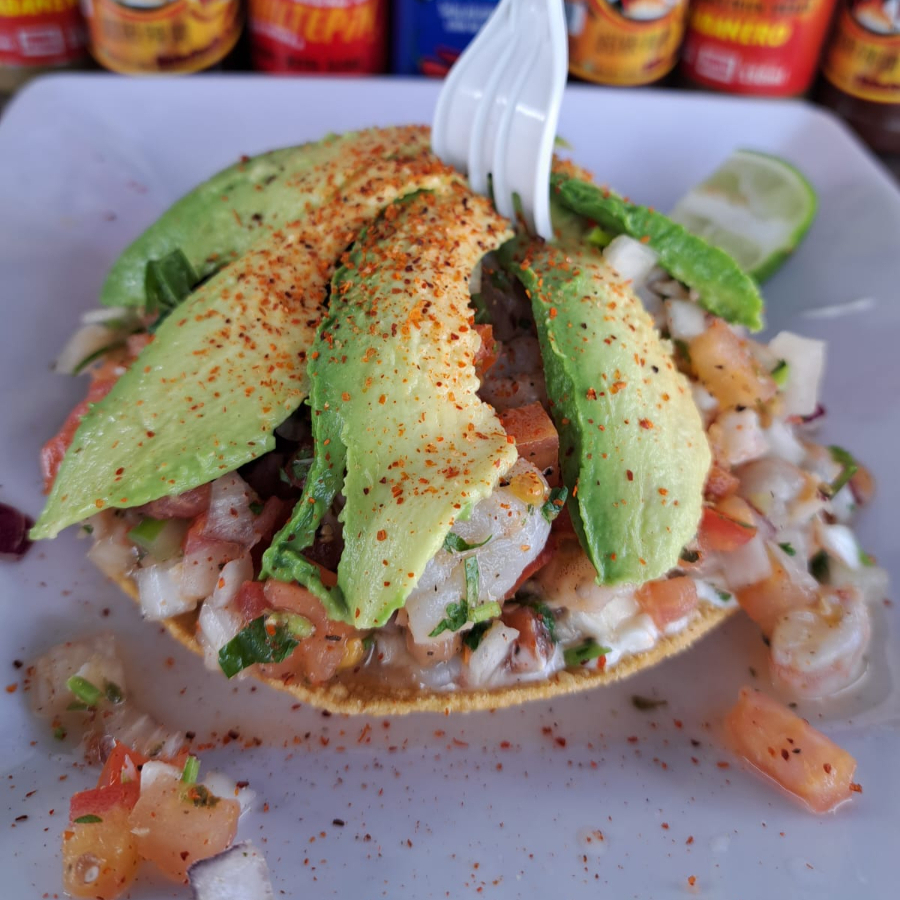 Tostada con una cama de ceviche de camarón, cama de aguacate, camarón cocido, aros de cebolla, pulpo y el sazón de la casa.
