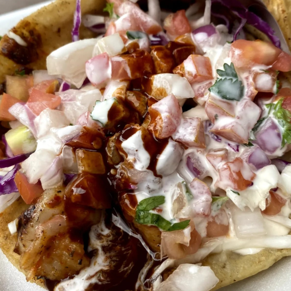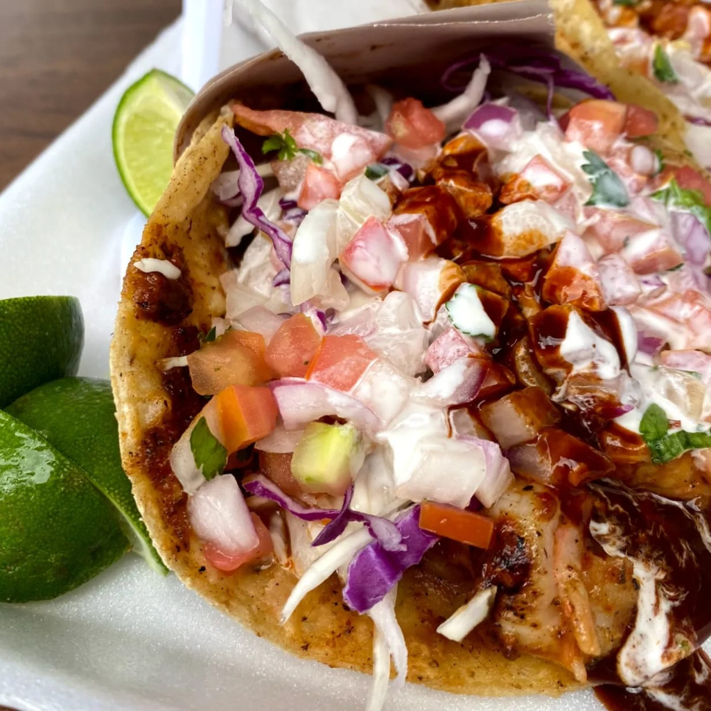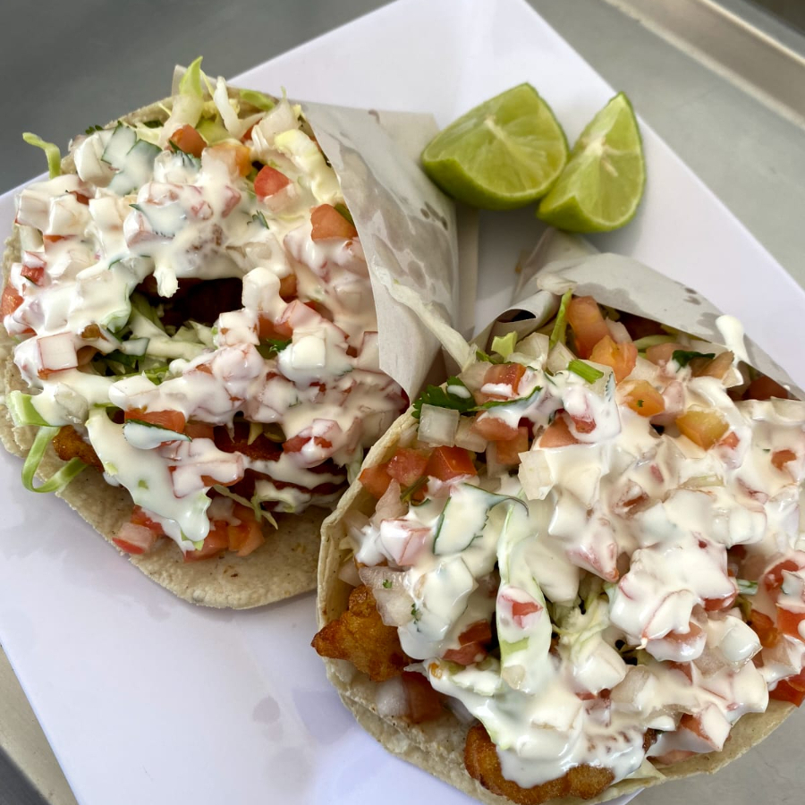 Delicioso taco de pescado a la plancha en tortilla de maiz, acompañado de repollo, mexicana y crema al gusto.