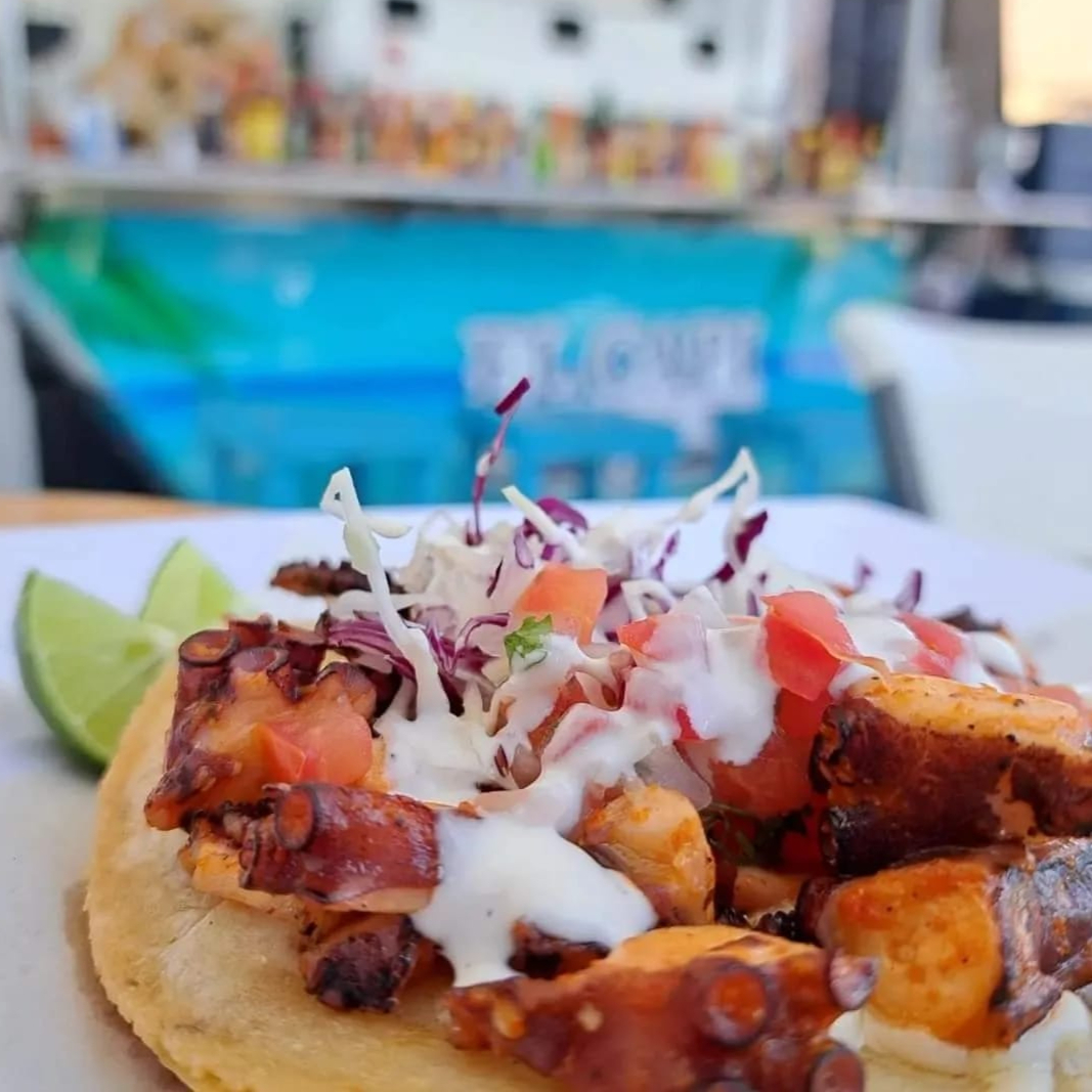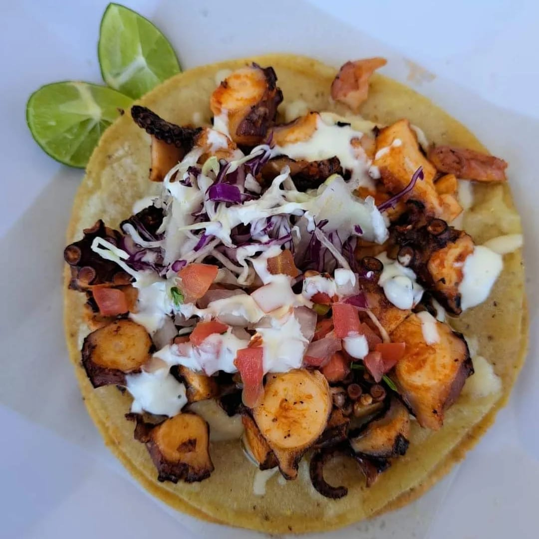 Tortilla de maiz dorada con queso, pulpo al olivo, acompañado de salsa mexicana (tomate, cilantro, cebolla) repollo y crema.