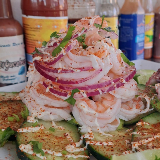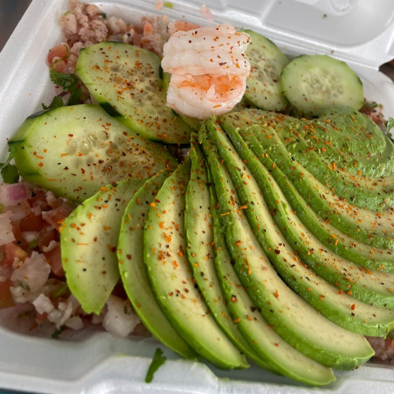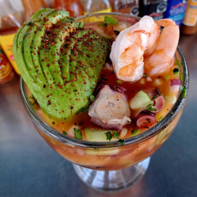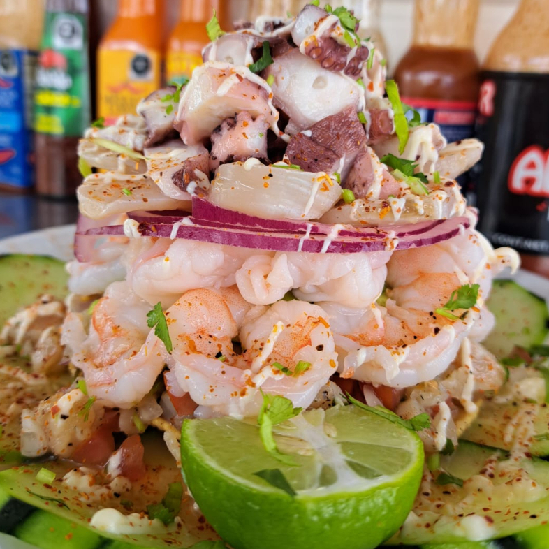 Ceviche de camarón, camarón cocido y pulpo, con el delicioso sazón de la casa. Porción aprox 3 pers.