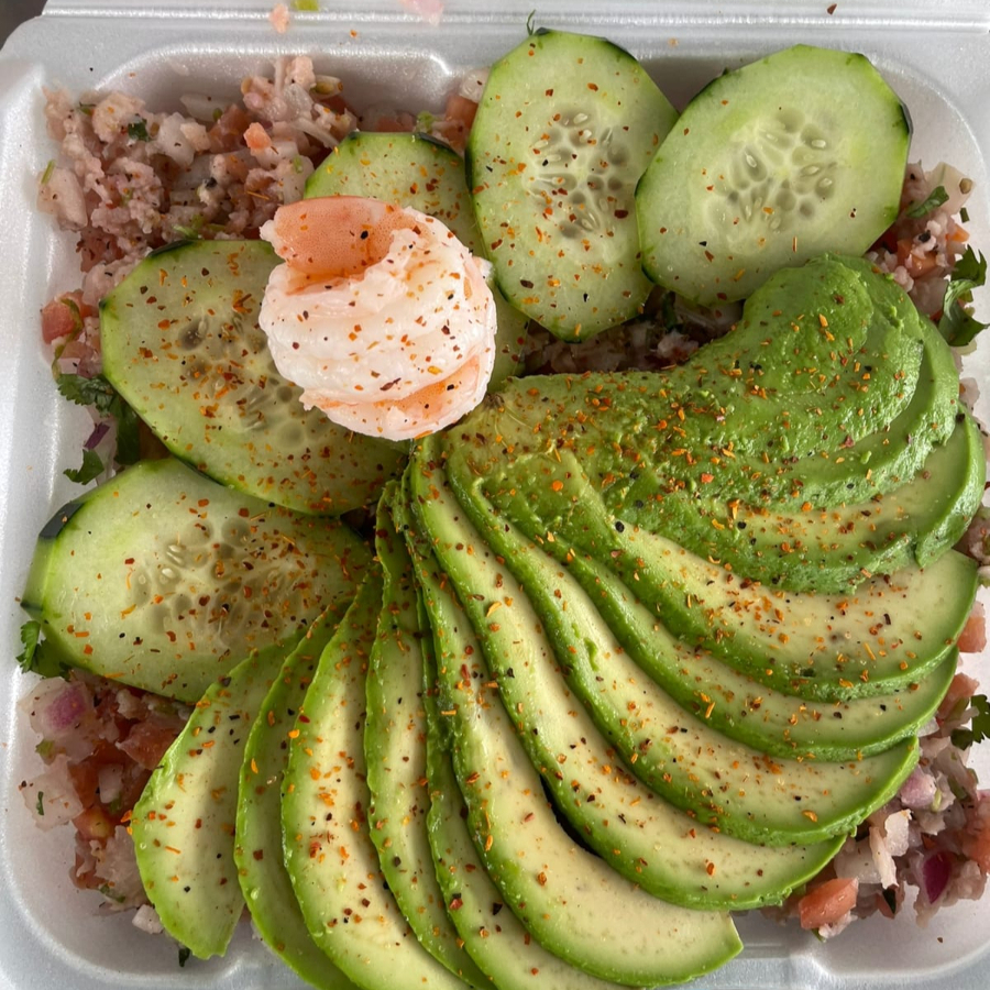 Coctel de camarón con mezcla de verduras, pepino, cilantro, cebolla, aguacate y catsup.