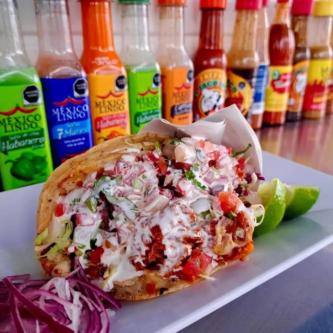 Delicioso taco de maiz estilo Ensenada, acompañado de salsa mexicana (tomate, cilantro, cebolla) repollo y crema.