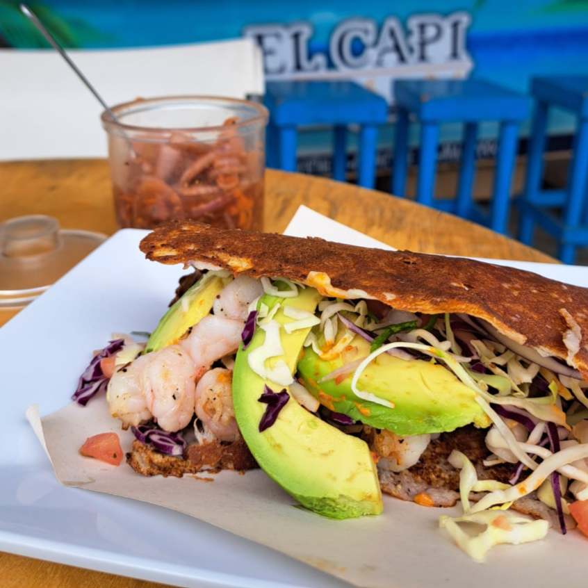 Tortilla de maiz dorada con queso, camarones a la plancha sazonados y enchilados, acompañado de salsa mexicana (tomate, cilantro, cebolla) repollo y crema.
