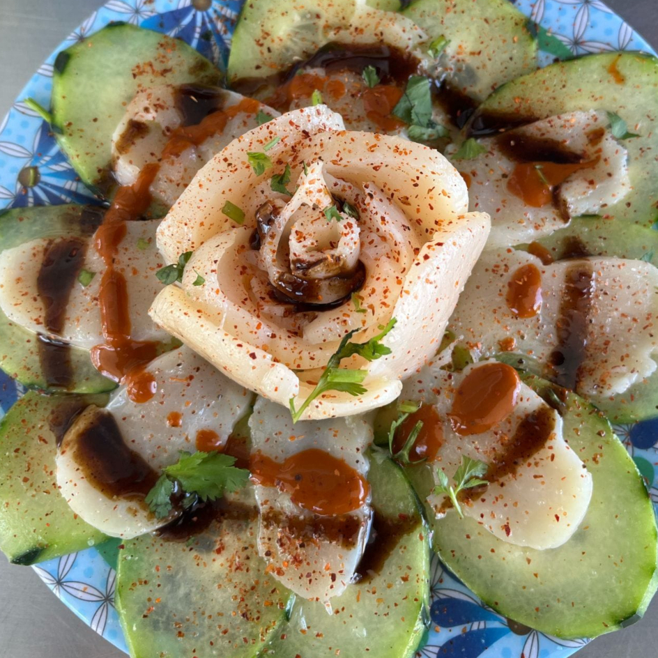 Delicioso callo de hacha fresco, tostada con 150 grms, rodajas de cebolla, pepino y el sazon de la casa.