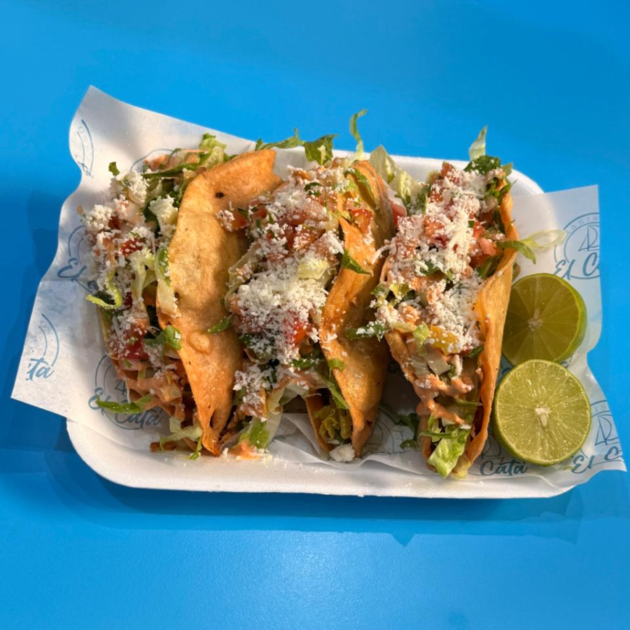 El famoso taco de camarón sinaloense en costra de queso, con aguacate y crema chipotle.