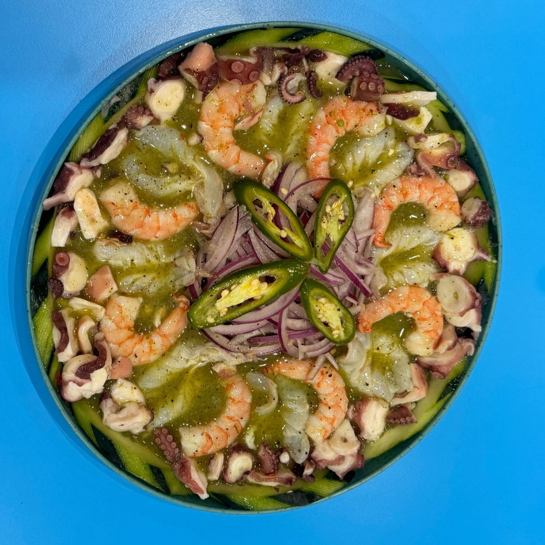 Mezcla de camarón aguachile, camarón cocido y pulpo, con cebolla morada y pepino en la salsa de tu elección.