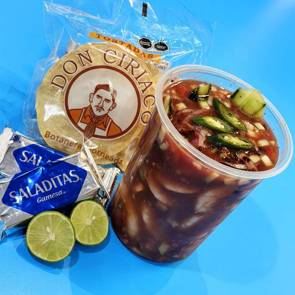Clásico de la casa con camarón curtido, cebolla morada y pepino, elige tu salsa: negra, chiltepín verde, roja, tamarindo o chiltepín con mango.