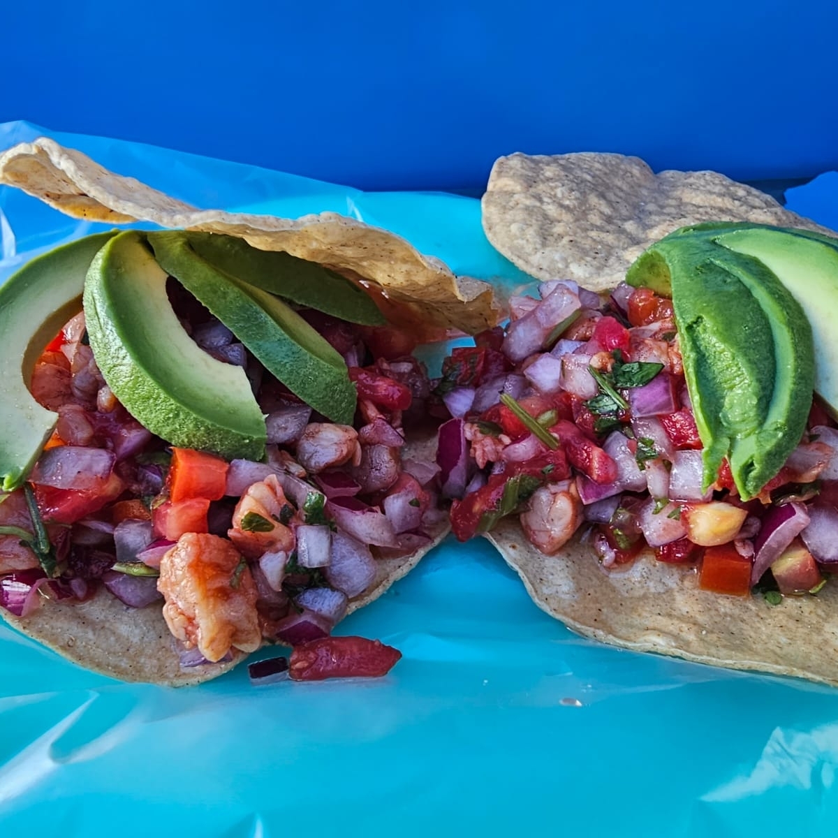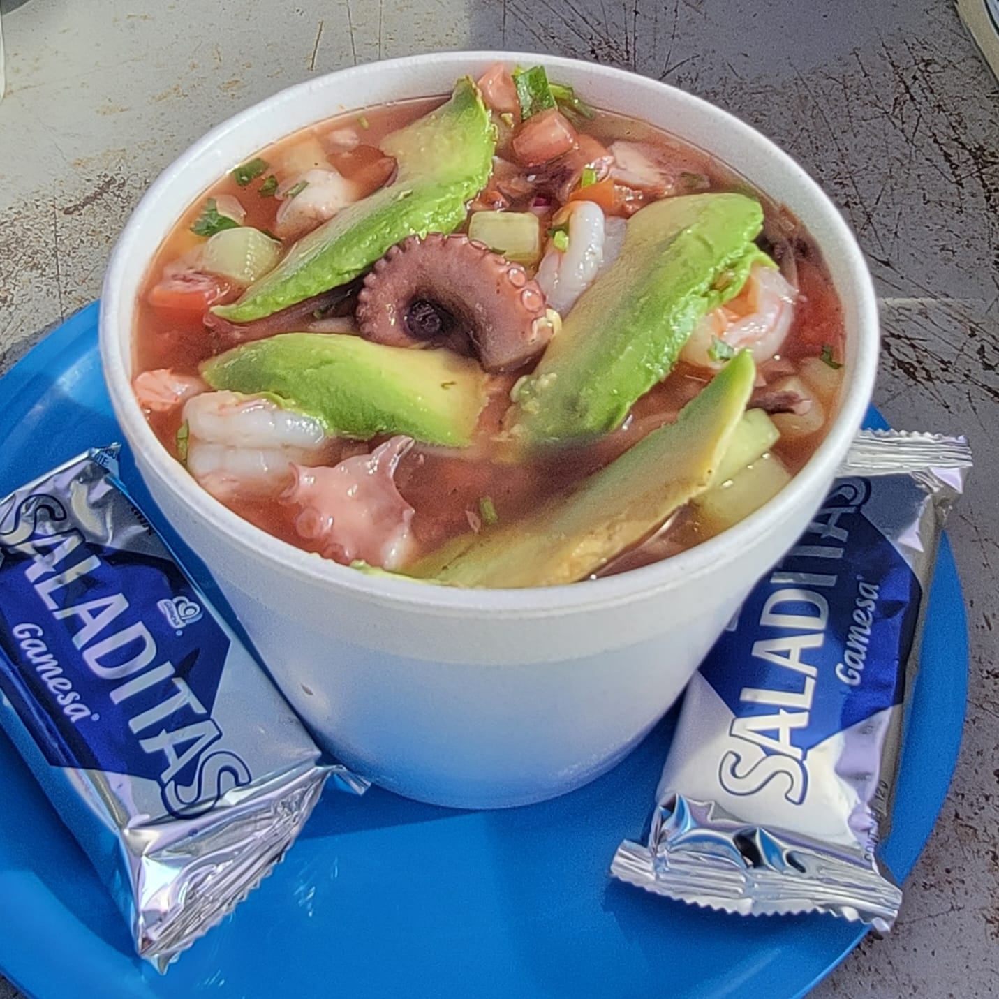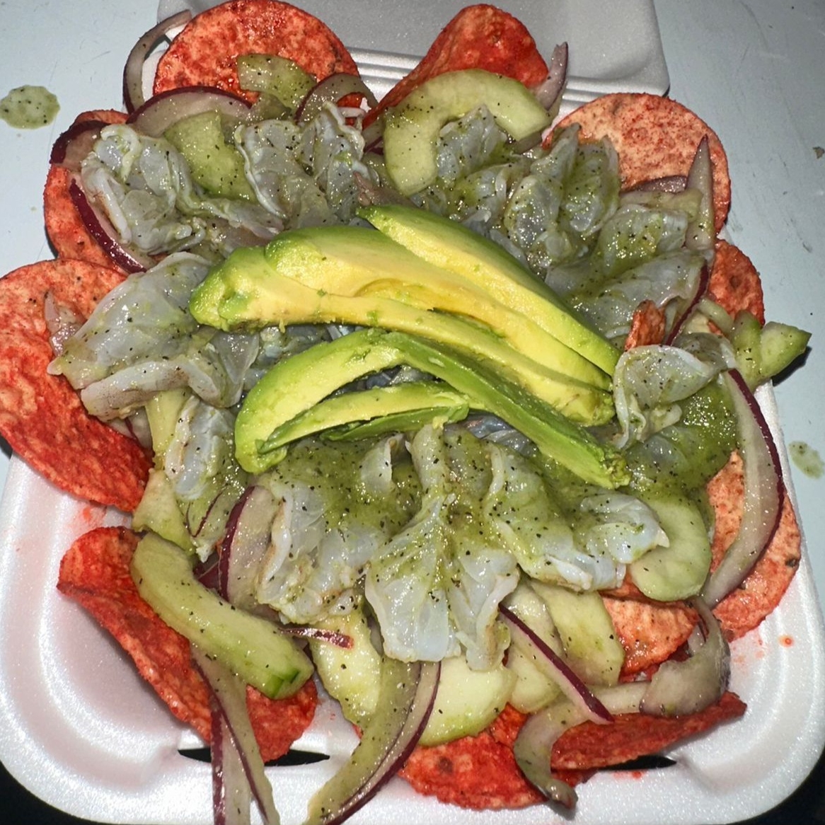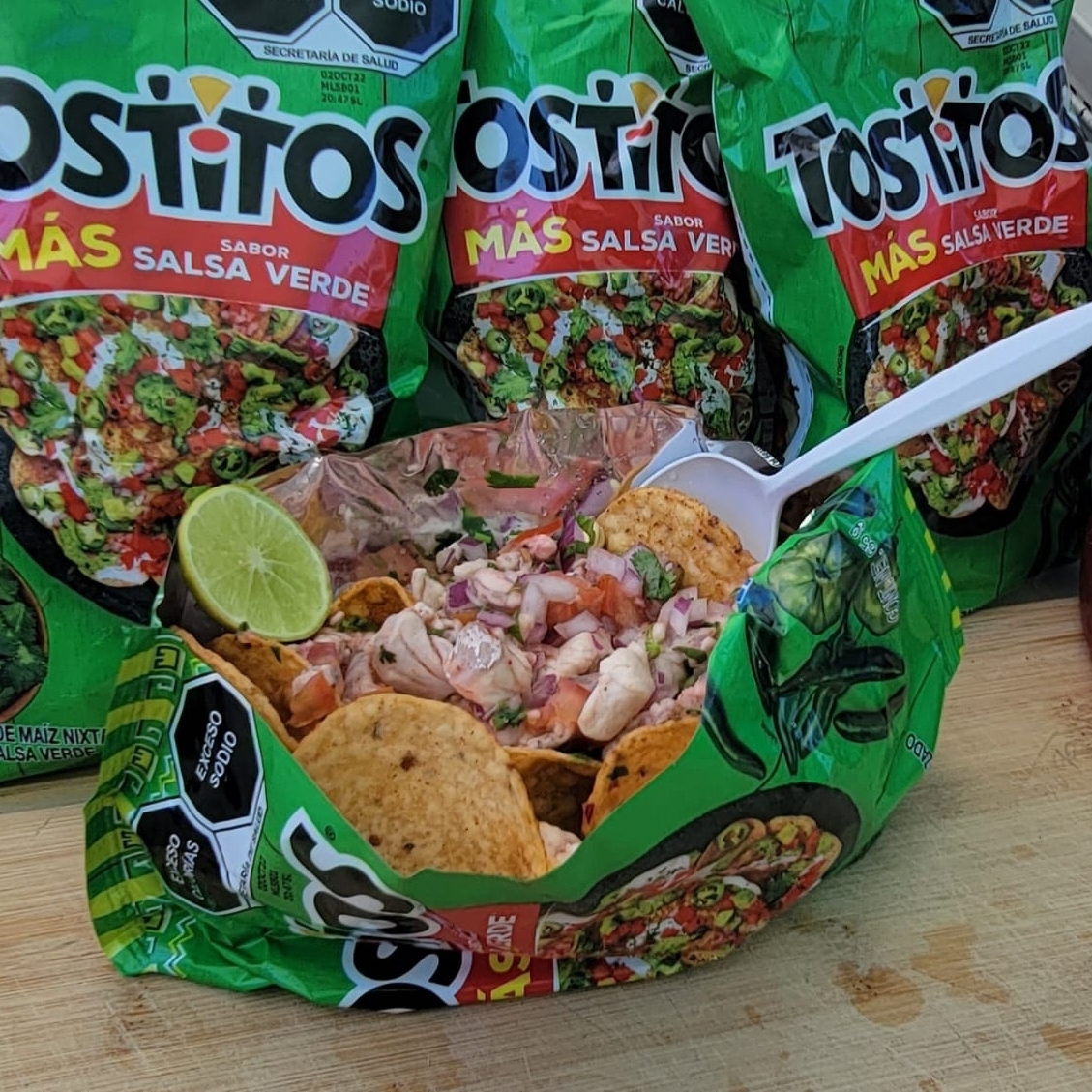 camarón curtido ,cebolla morada ,pepino y aguacate en una salsa(roja , verde, negra o habanero) de un paquete de tostitos
