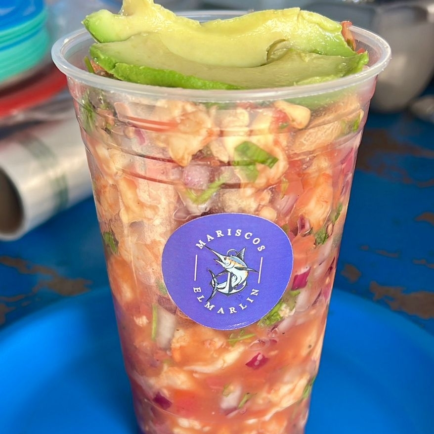 Coctel de camaron cocido, tomate, cebolla, cilantro, pepino y aguacate