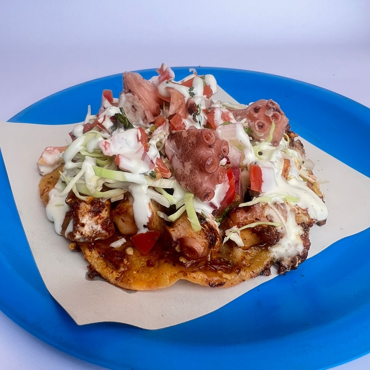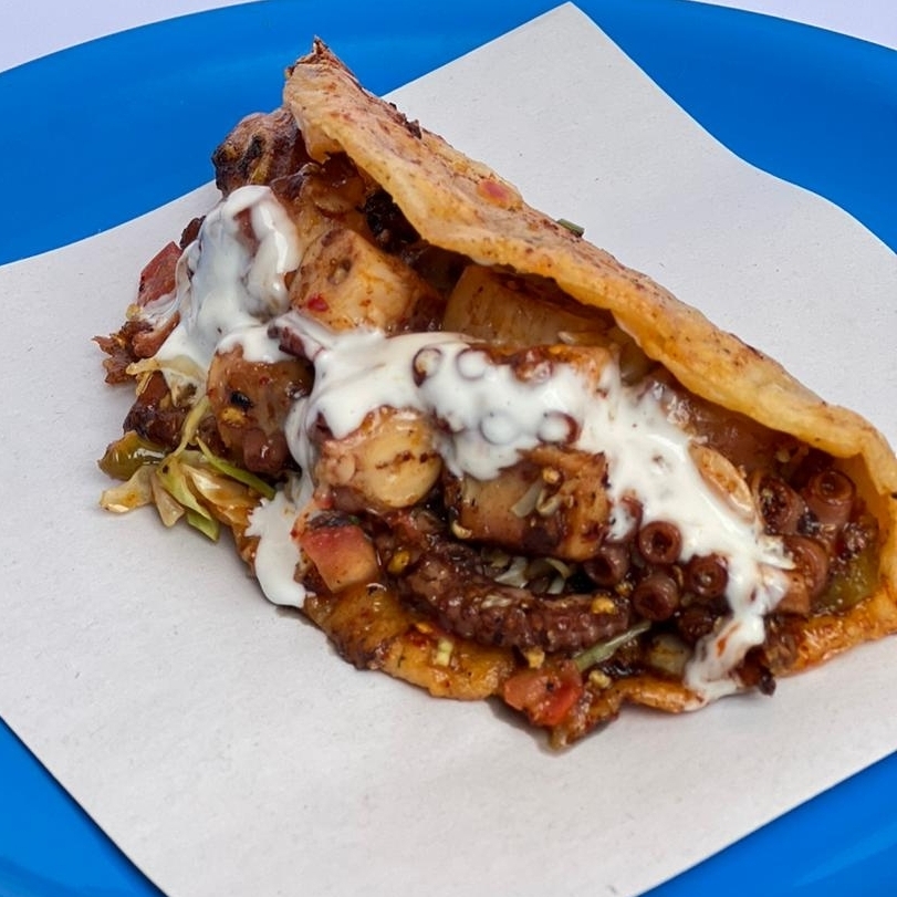 Quesadilla de maíz con pulpo enchilado acompañado de repollo, pico de gallo y crema