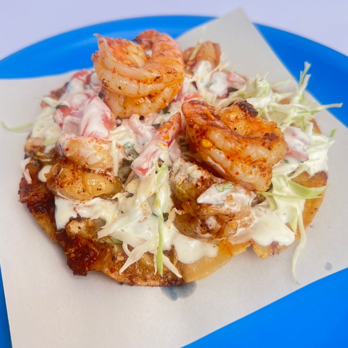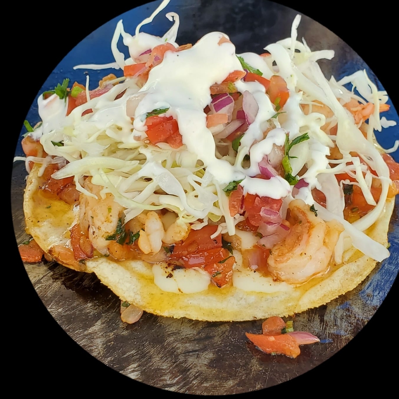 tortilla de maiz con queso con camarones al ajo con aceite de olivo acompañado de repollo, pico de gallo y crema