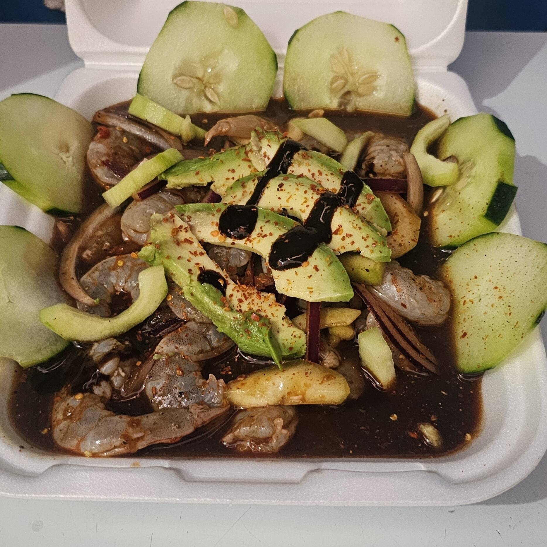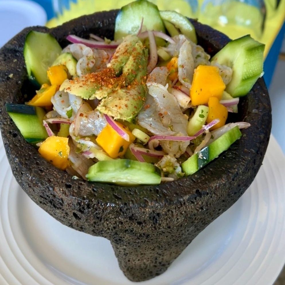 camarones curtidos con aguacate ,cebolla morada y pepino en salsa rosa de chile chiltepin