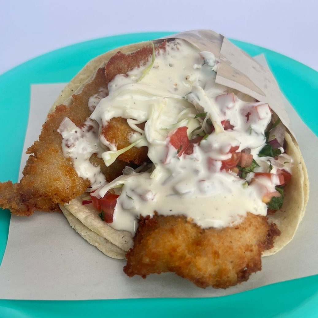 Taco de pescado empanizado crujiente acompañado de repollo , pico de gallo(tomate, cebolla y cilantro) y crema