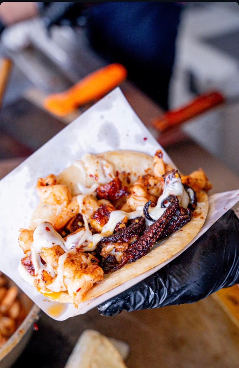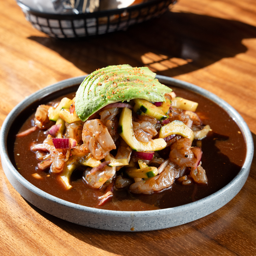 Cama de tototpos, camarón cocido, camarón crudo y pulpo. Mezcla de salsas. (Incluye galletas saladas aparte).