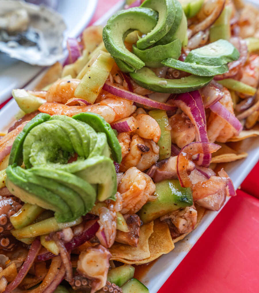 Pulpo, camarón cocido y ceviche de pescado. (Incluye galletas saladas aparte).