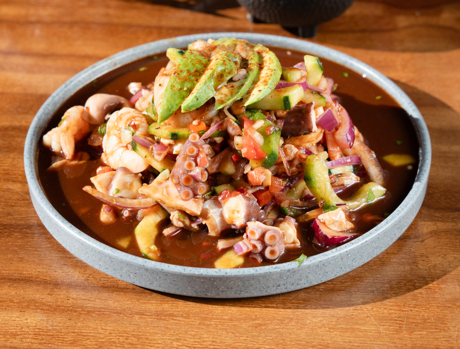 Camarón cocido, pulpo cocido, clamato, pico de gallo y mezcla de salsas. (Incluye galletas saladas y tostadas).