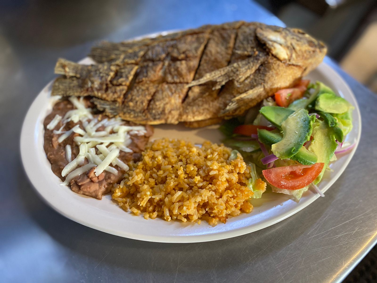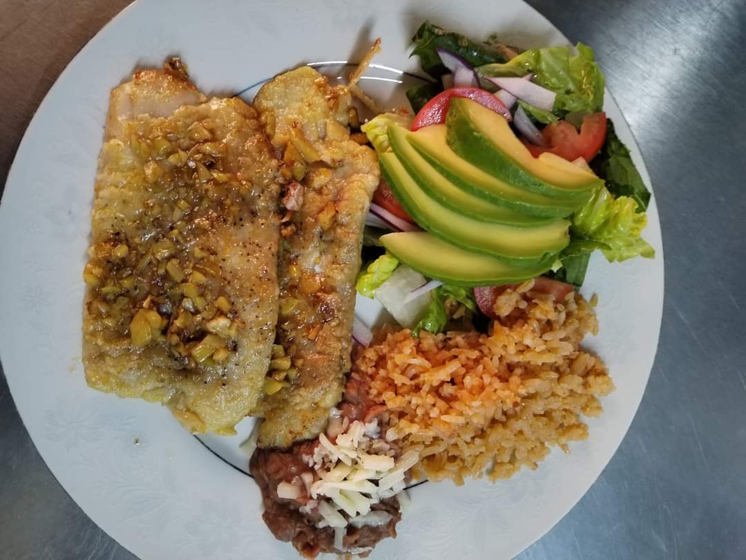 Filete de pescado ala plancha bañado con Ajo, ensalada,arroz, tortillas.