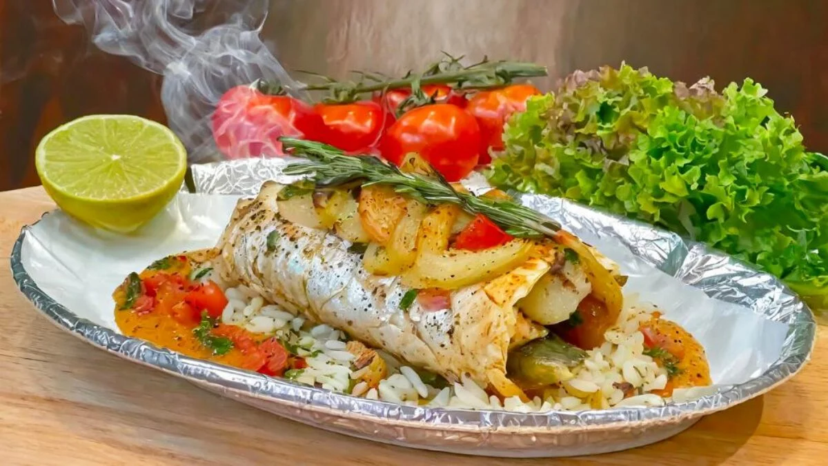 Con marlin y queso envueltos en tocino. Acompaños de arroz y ensalada