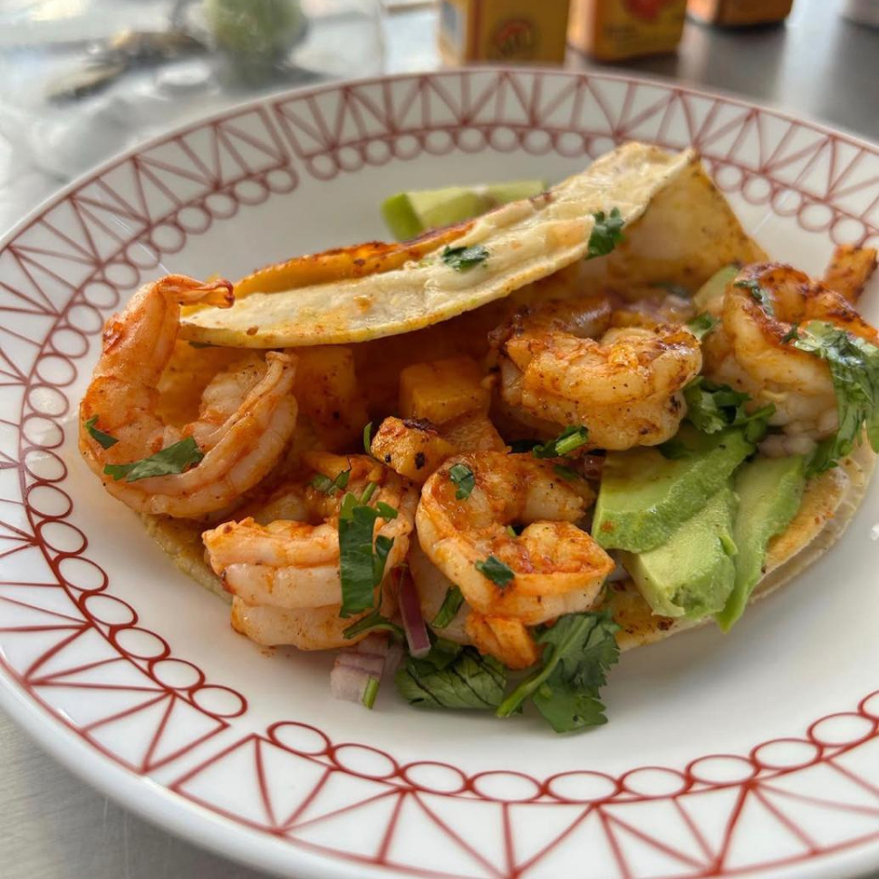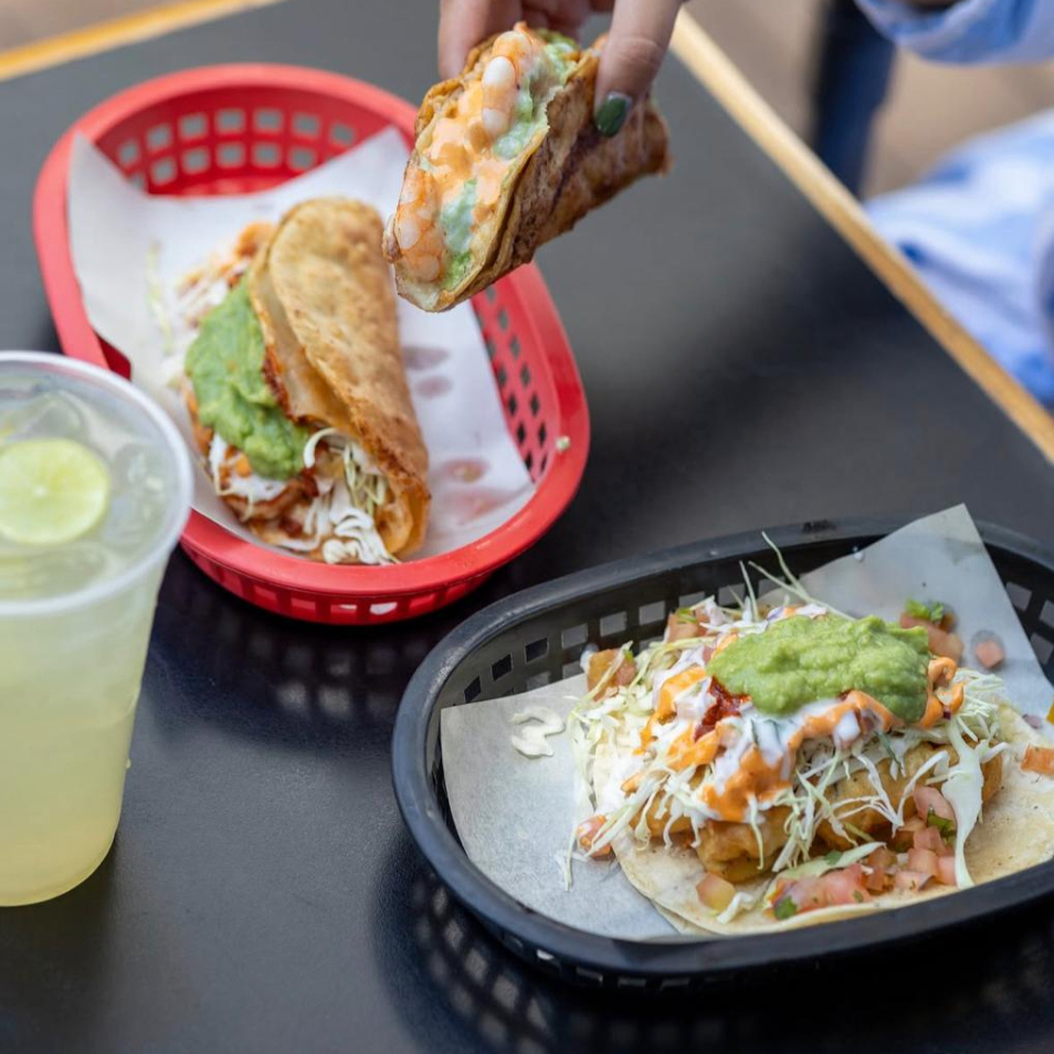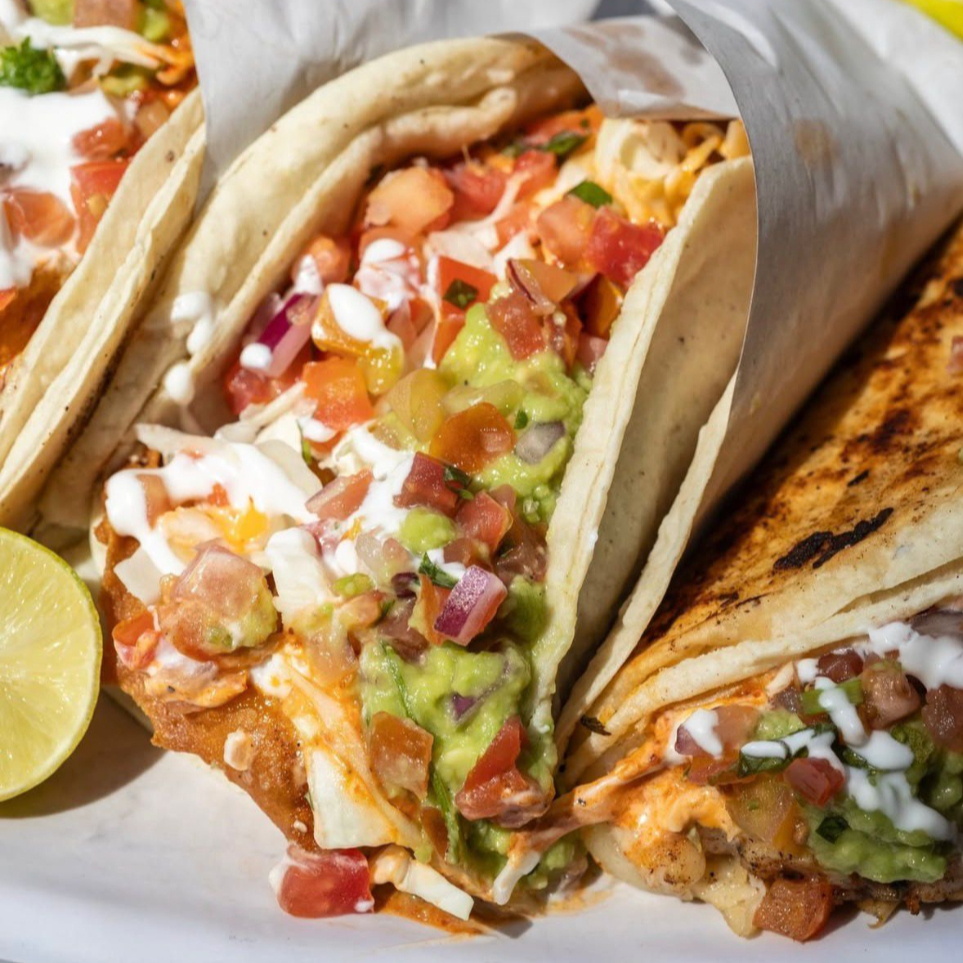 Camarón y pulpo, con repollo, pico de gallo, aderezo chipotle, crema, guacamole, chipotle.