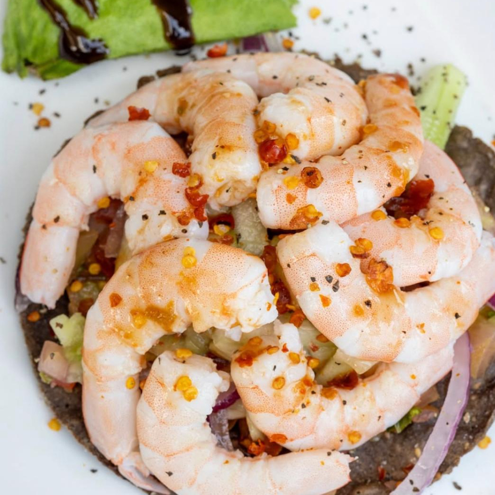 Tostada de ceviche de camarón.