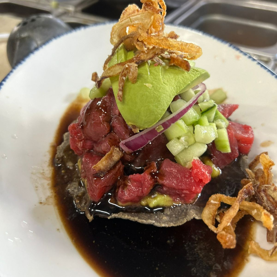 Aguachile, medallón de atún, pulpo, camarón cocido en salsas negras.