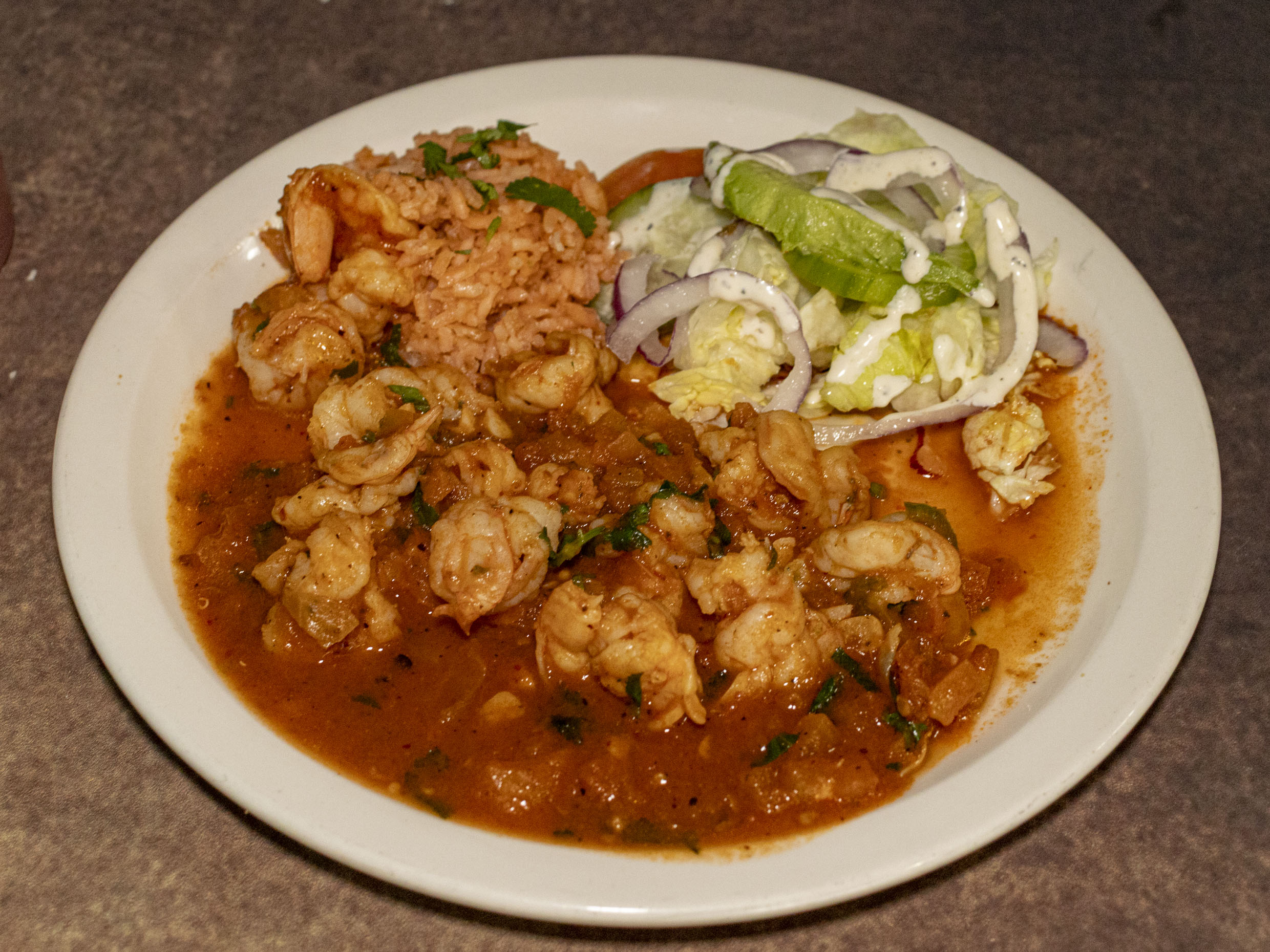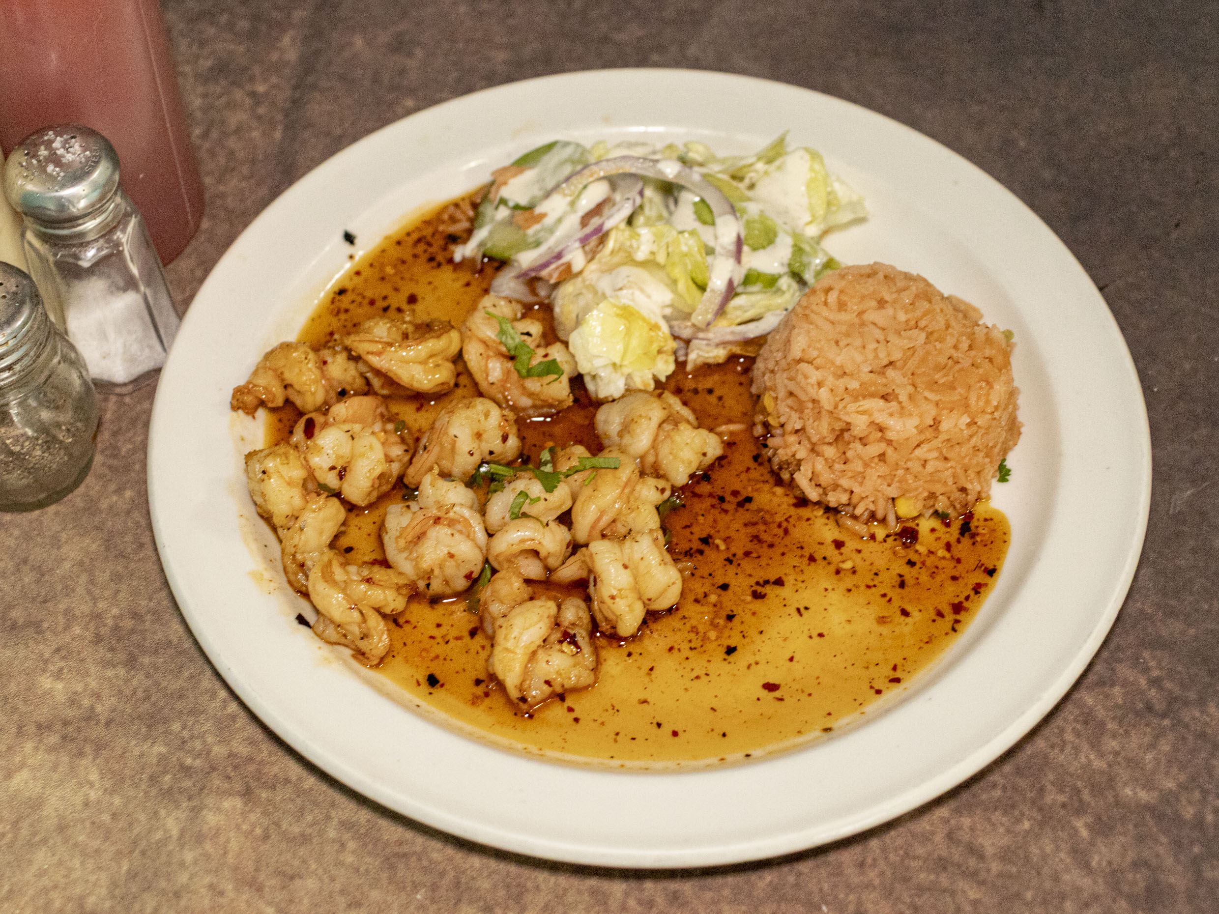 Camarón guisado con toque de mantequilla y chile quebrado gratinado con queso Monterrey.