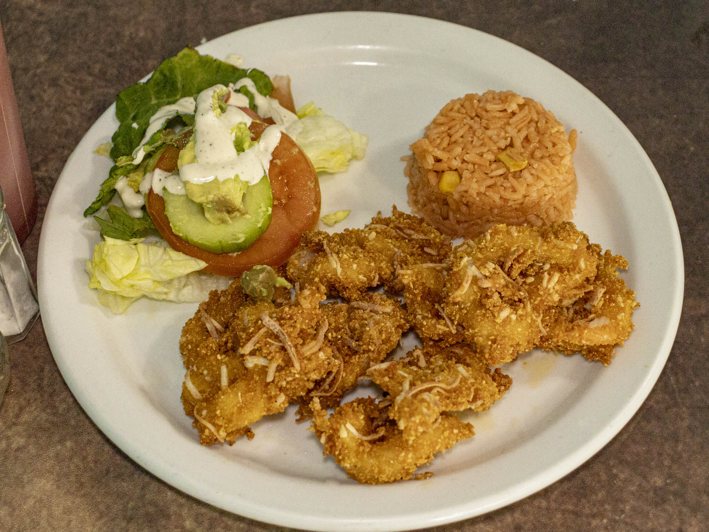 Filete de pescado empanizado, aguacate, tomate, cebolla morada y aderezo de la casa.