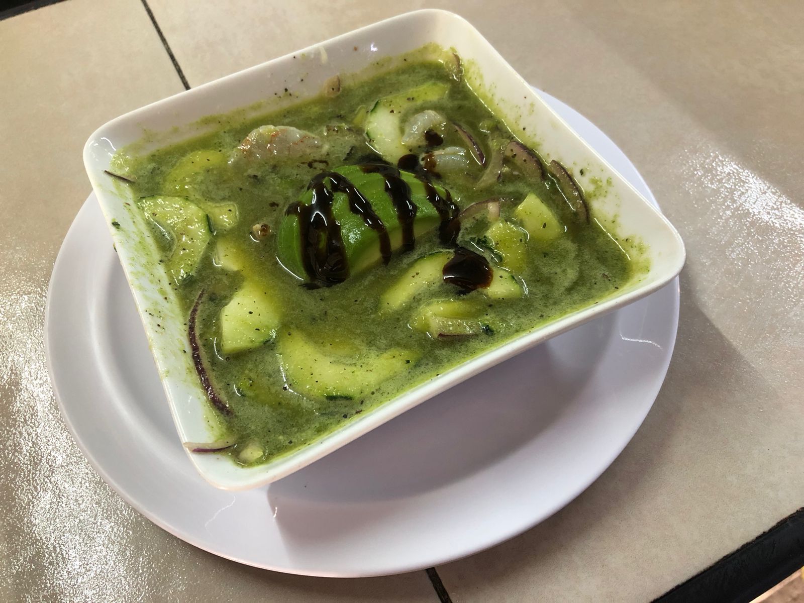 Camarón crudo curtido con limón, cebolla y pepino en una sala verde picante
