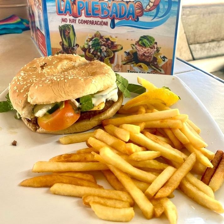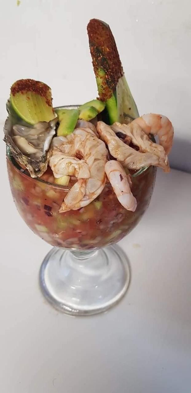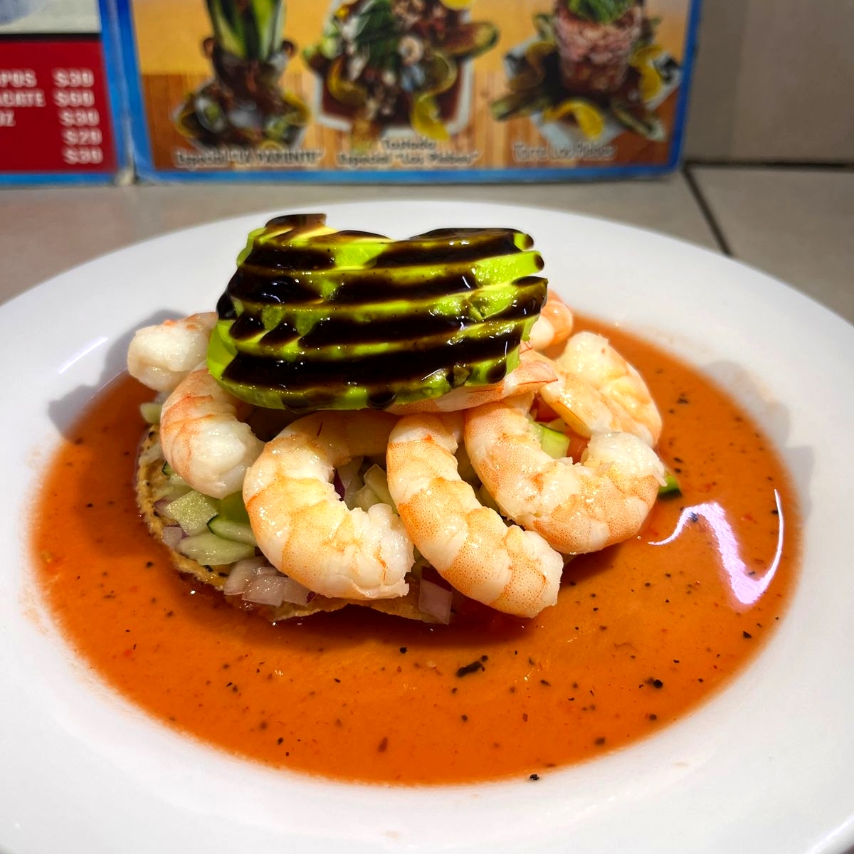 TOSTADA, 10 CAMARONES PORCION DE CEBOLLA, PEPINO AGUACATE, GALLETAS MAYONESA CATSUP