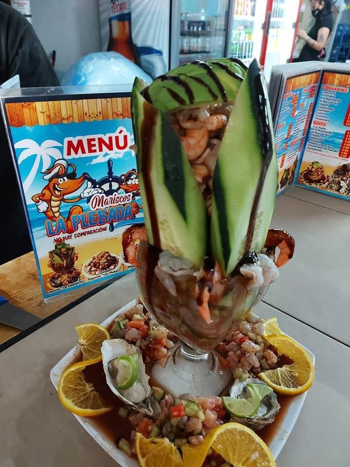 Ceviche de pescado, ceviche de camarón, pulpo, calamar, medallón de , camarón crudo, camarón cocido y 1 ostión. Incluye tostadas, galletas, catsup, mayonesa y chile