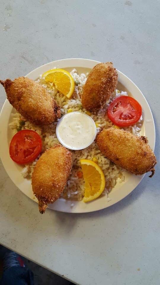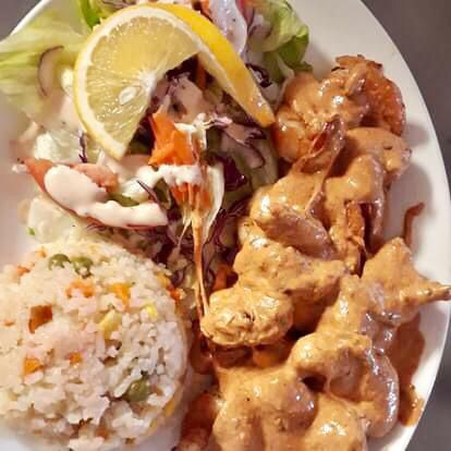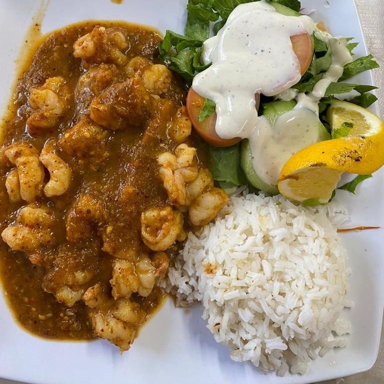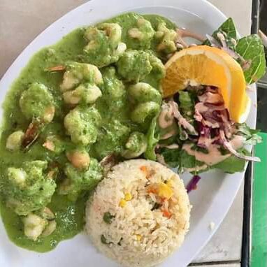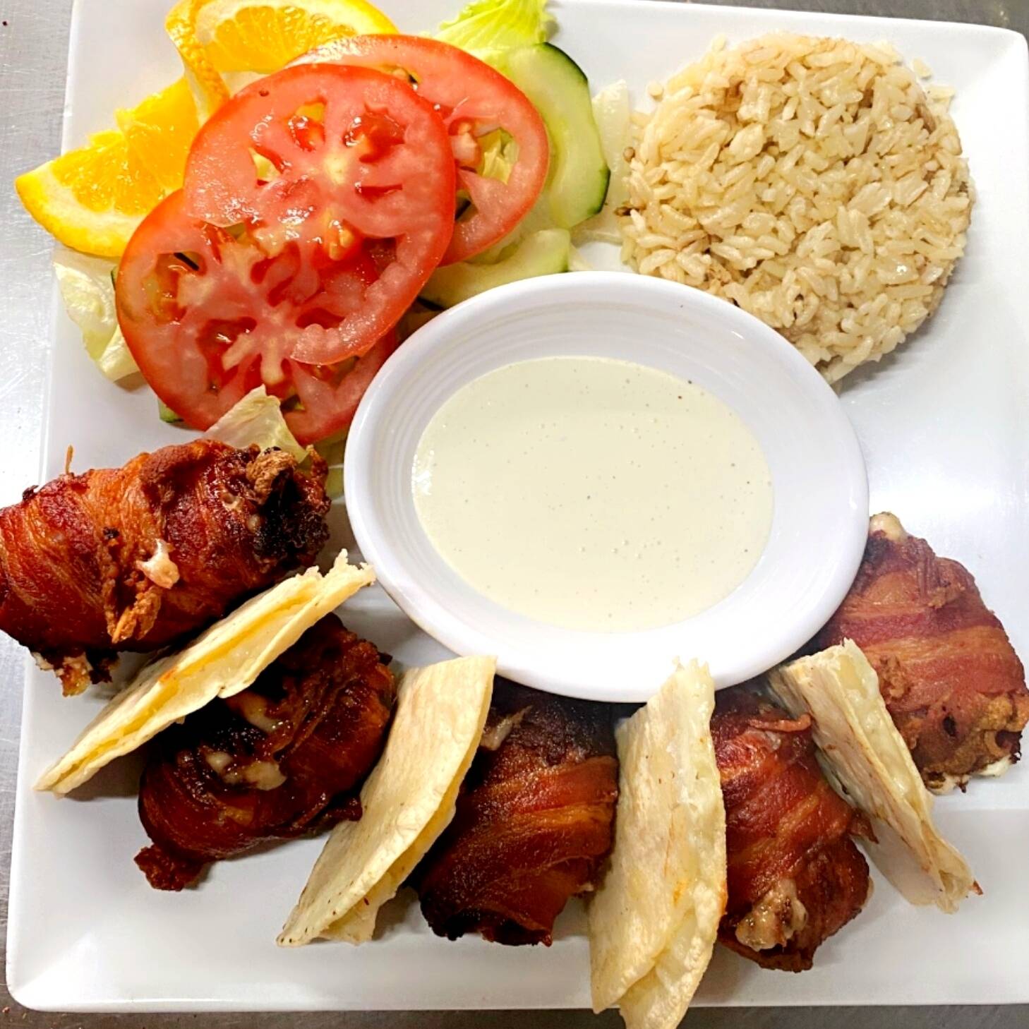 Camarones con queso Philadelphia, Marlin con queso, envueltos en tocino. Acompañados de ensalada y arroz. Incluye tortillas, limón y chile