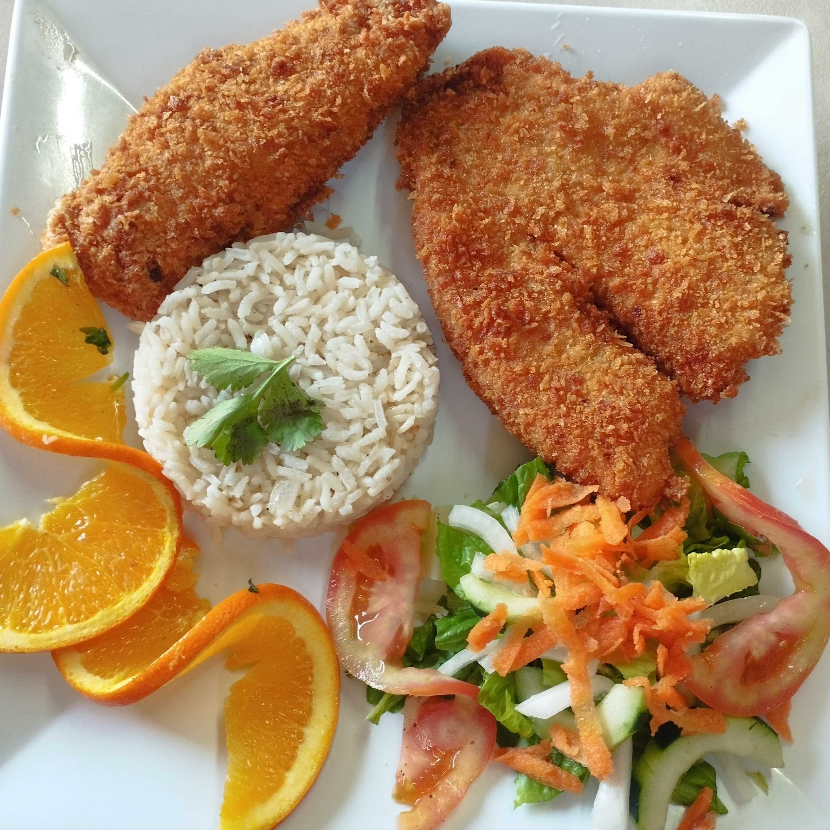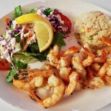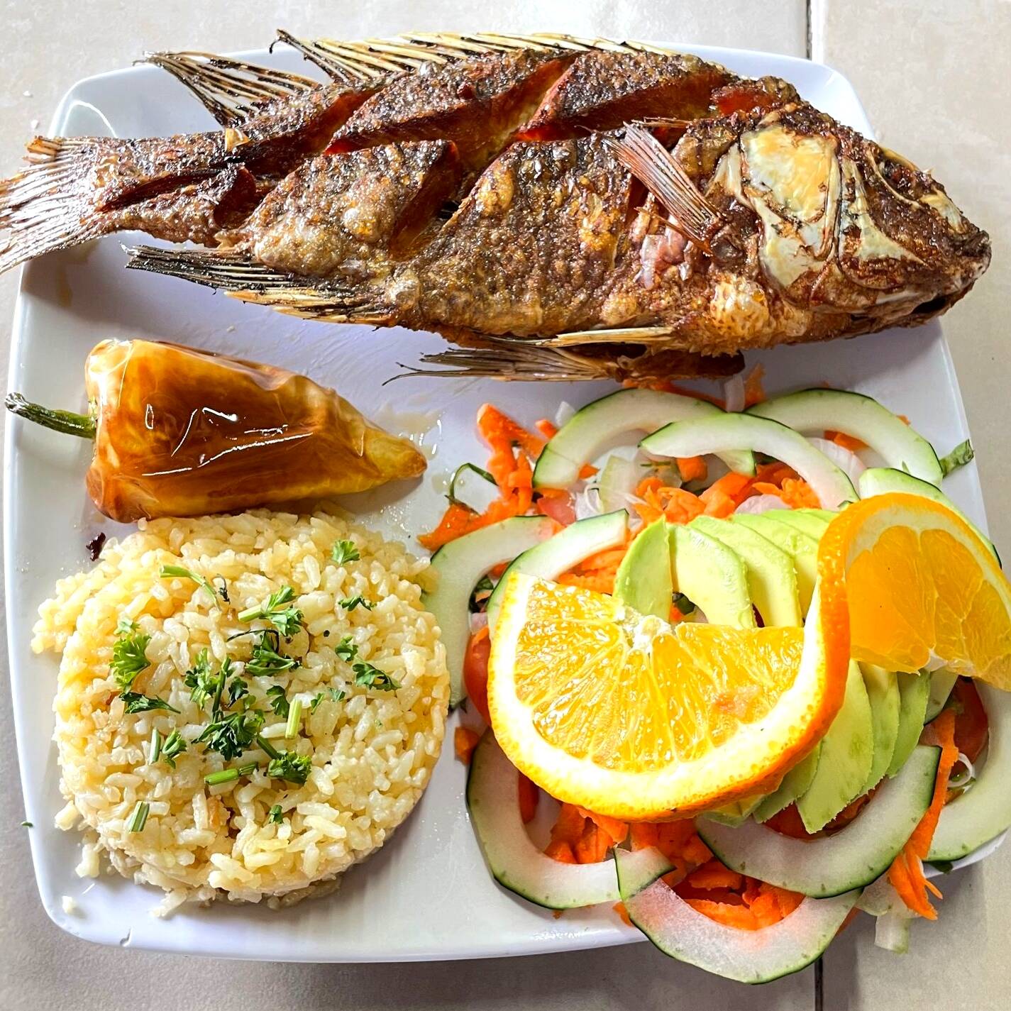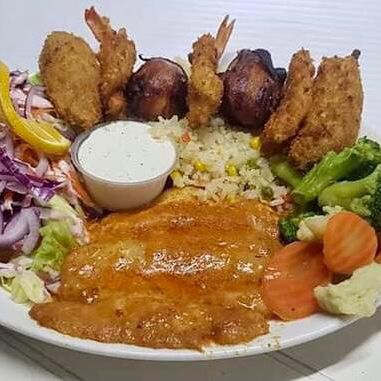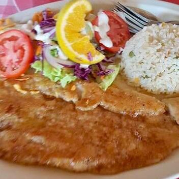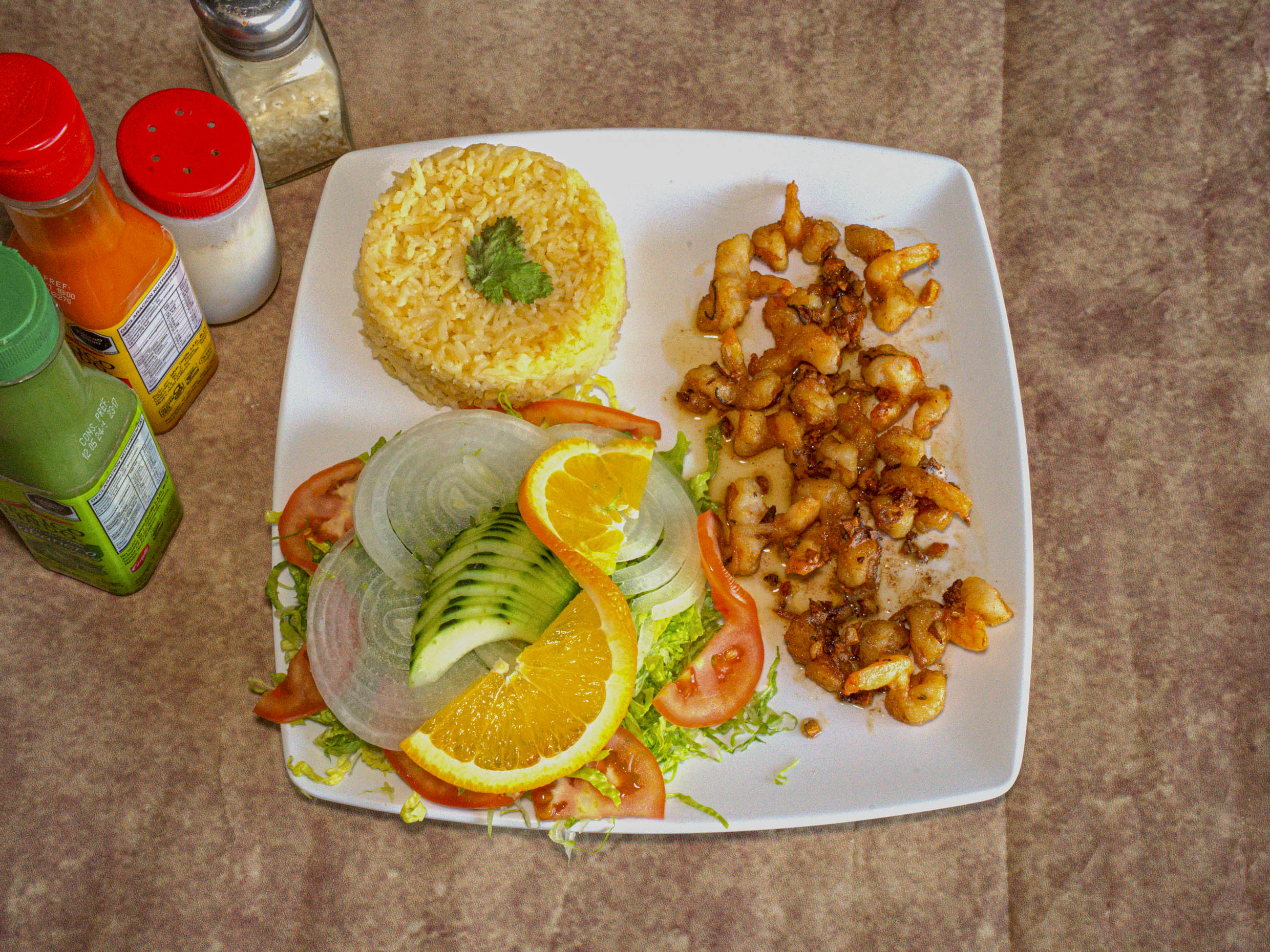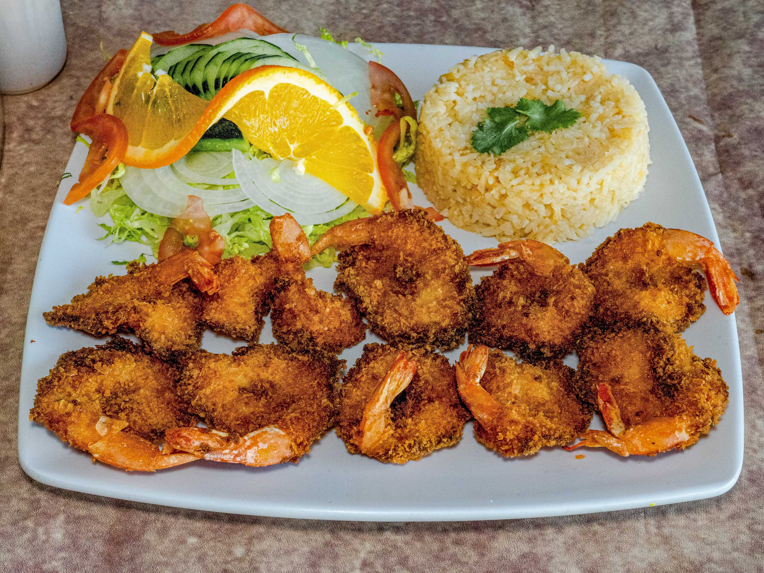 Camarones empanizados, costa azul, filete y toritos con ensalada , arroz y tortillas