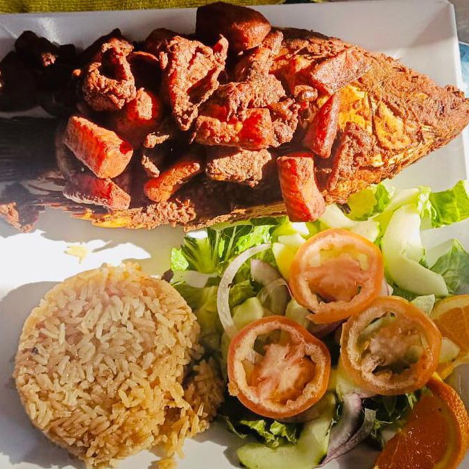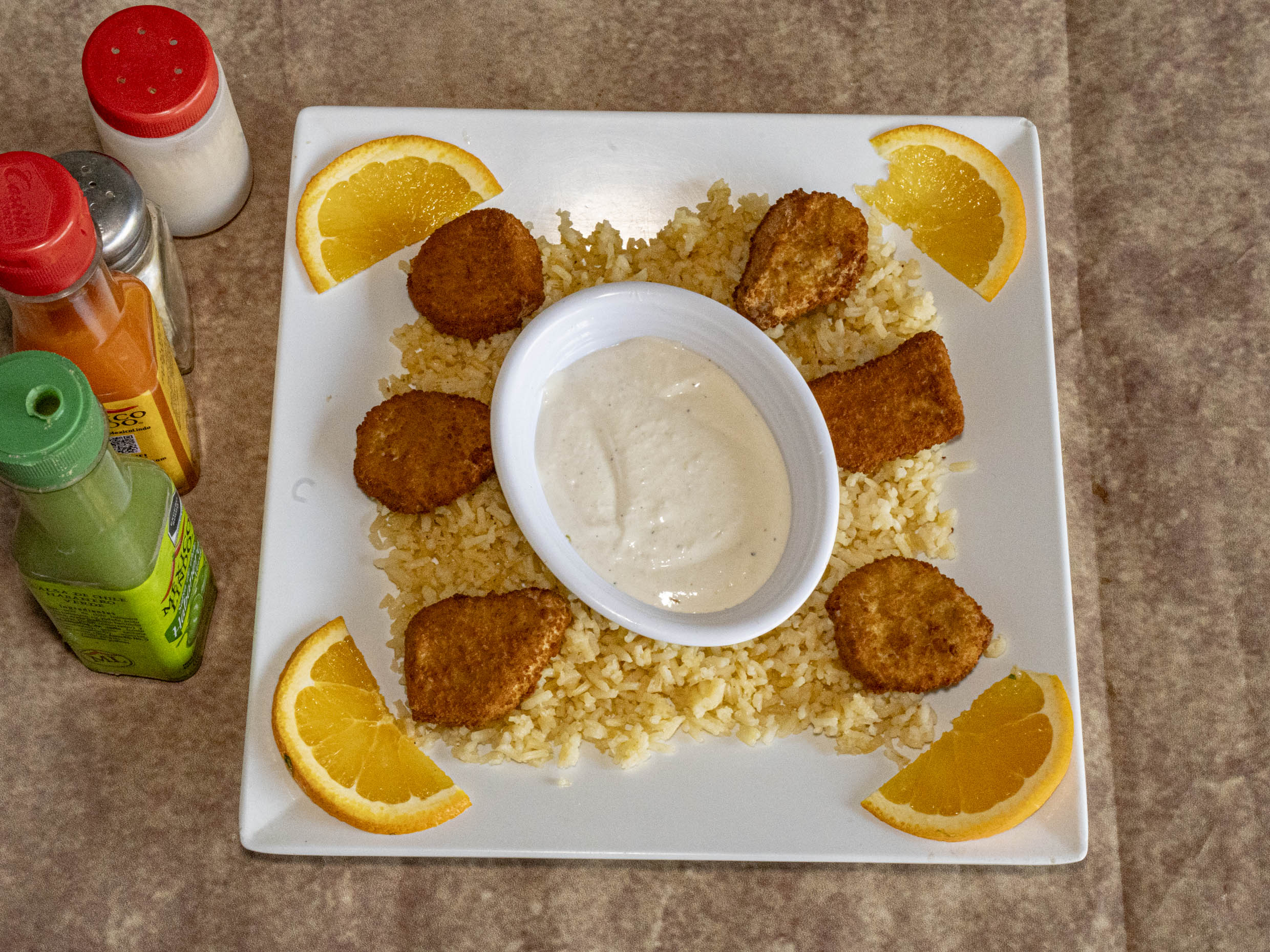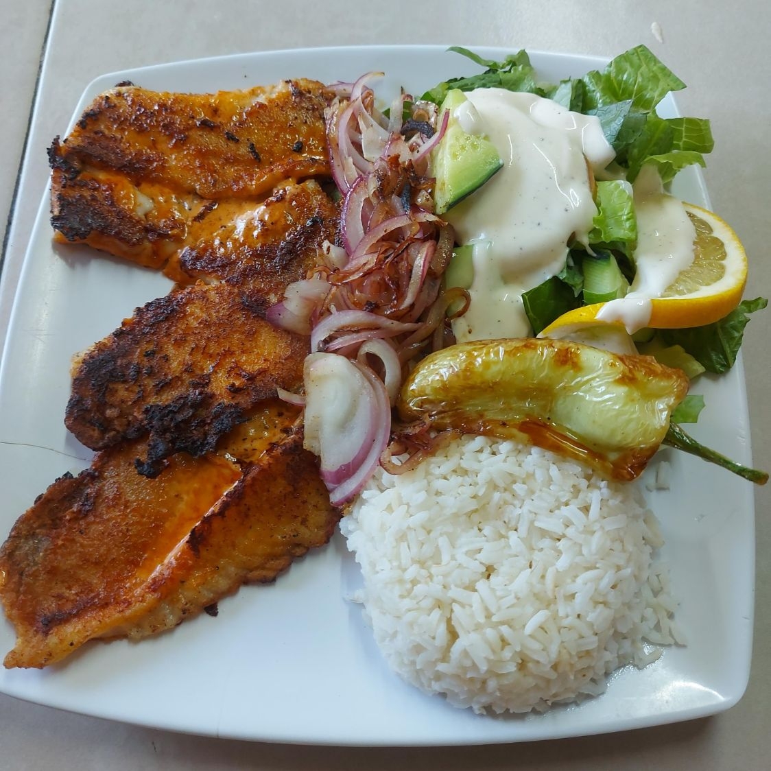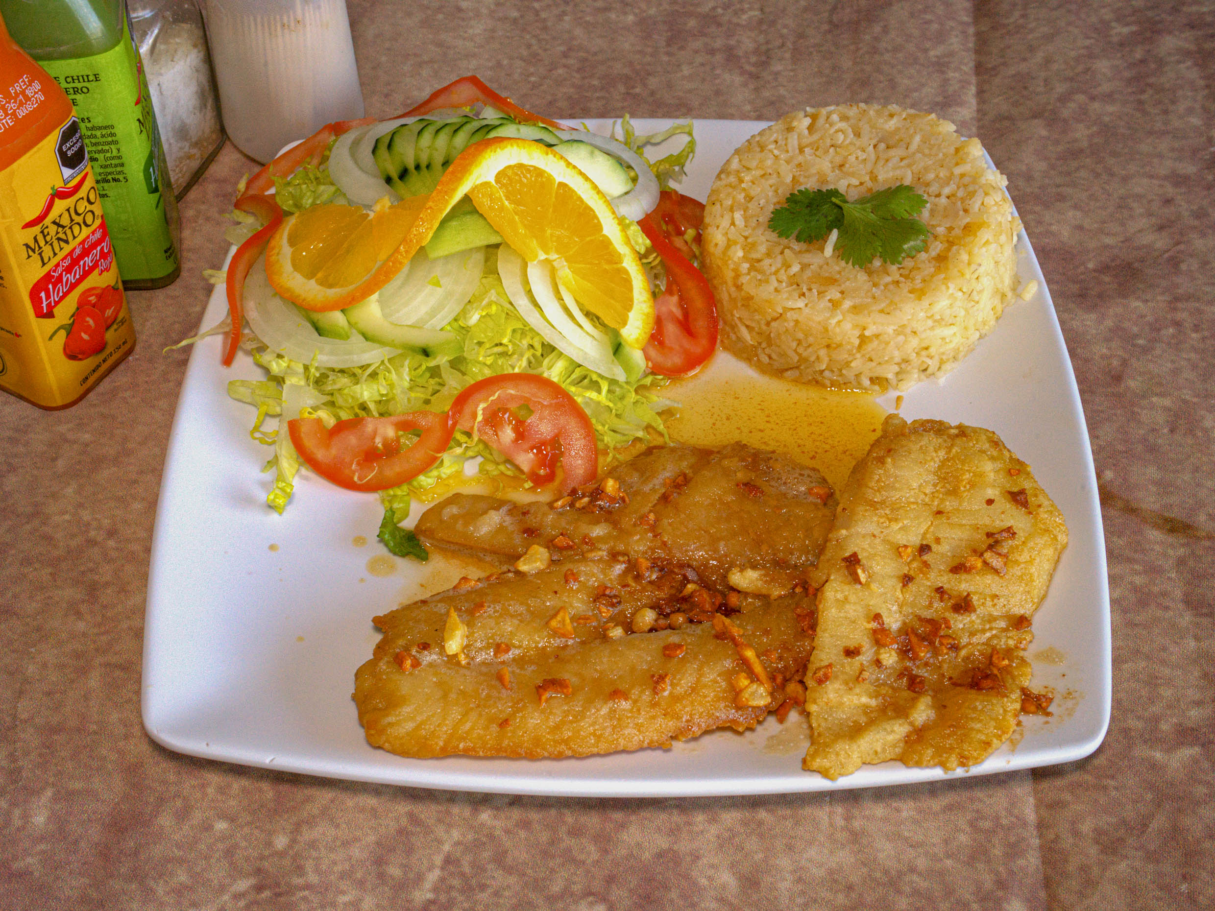 Camarones empanizados, costa azul, filete y toritos con ensalada , arroz y tortillas