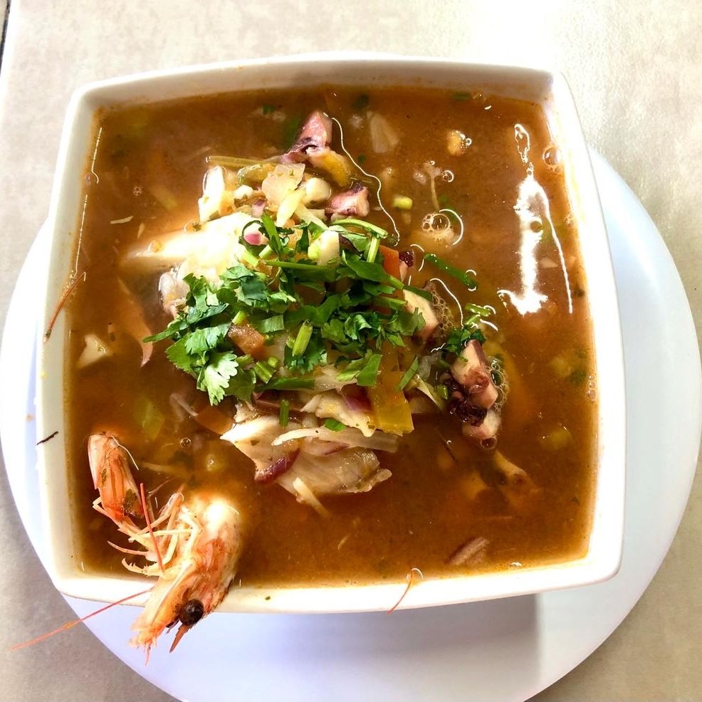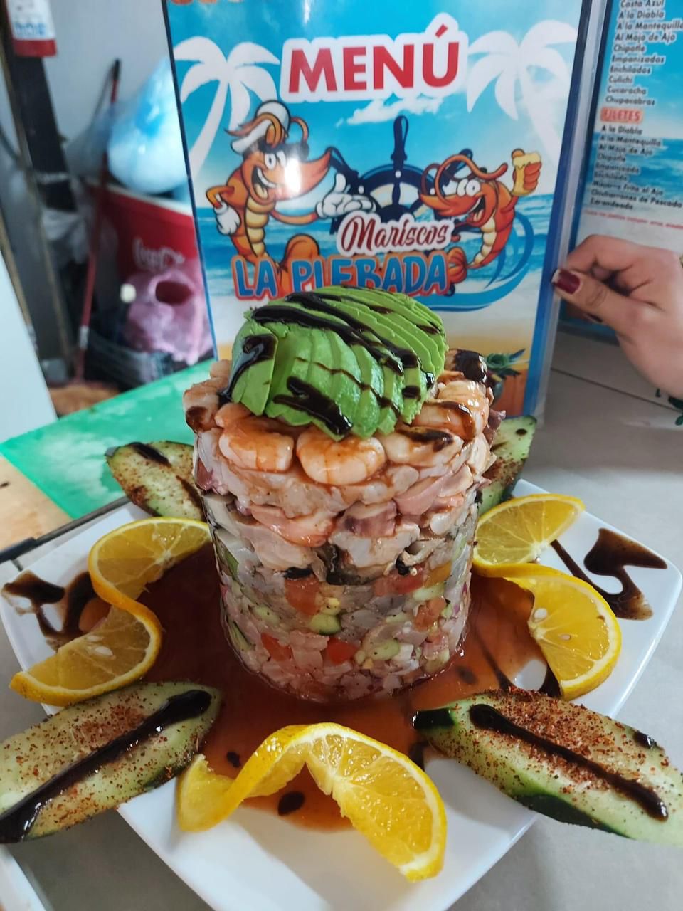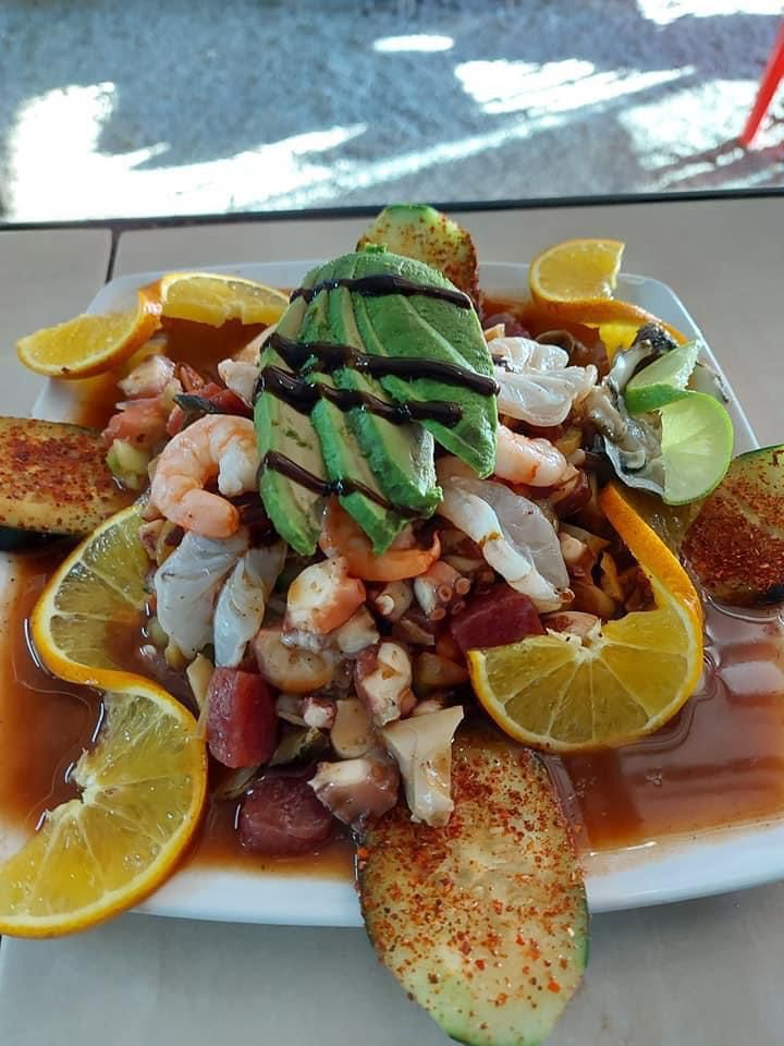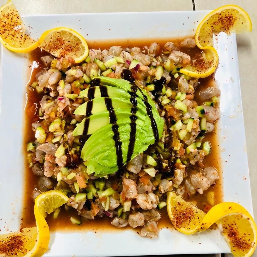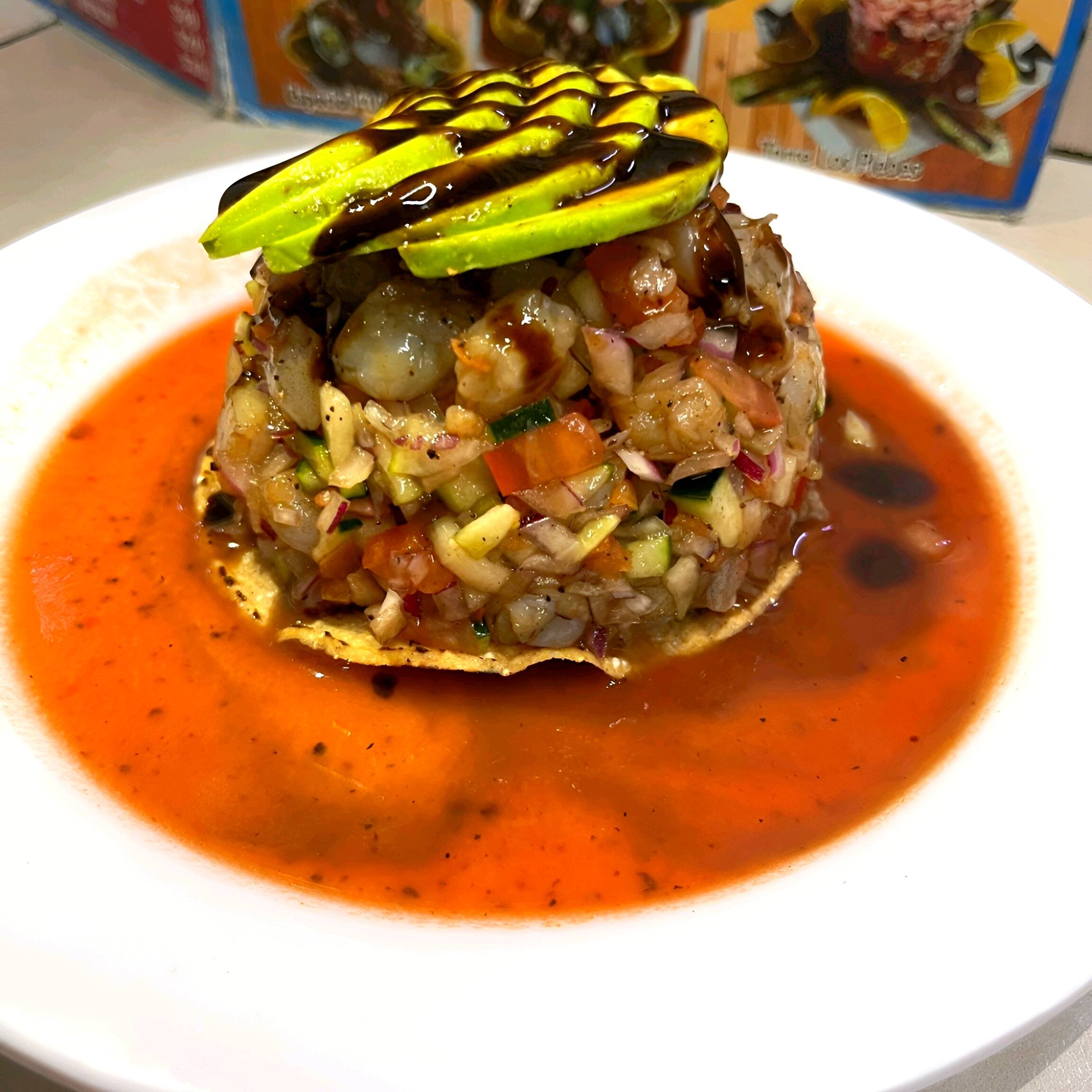Ceviche de pescado, ceviche de camarón, pulpo, calamar, camarón crudo, camarón cocido. Incluye salsa de la casa, tostadas, galletas, catsup, mayonesa y chile