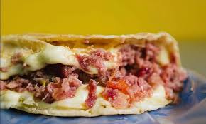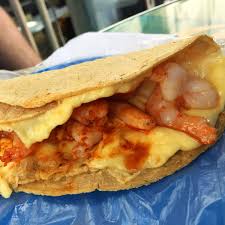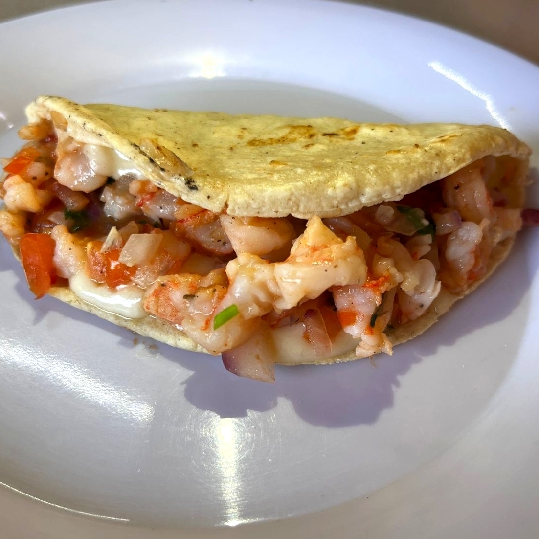 Tortilla de harina con queso y camarones guisados con tomate y cebolla. Incluye limón y chile aparte