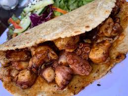 Tortilla de harina con Marlin guisado con tomate, cebolla y poblano.