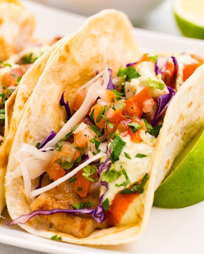 Tortilla de harina, queso y pescado capeado acompañado con repollo, salsa bandera y aderezo. Incluye limón y chile aparte