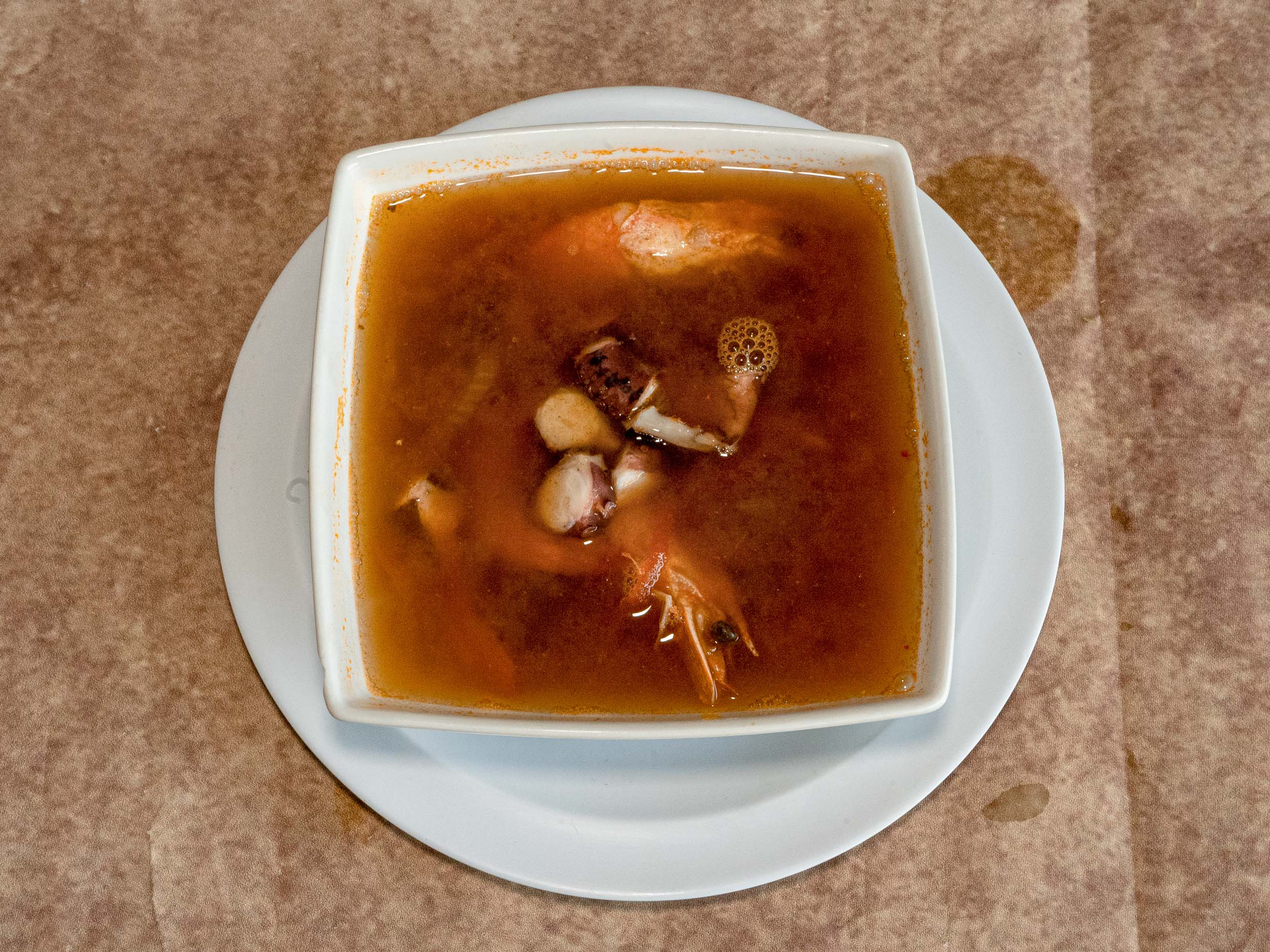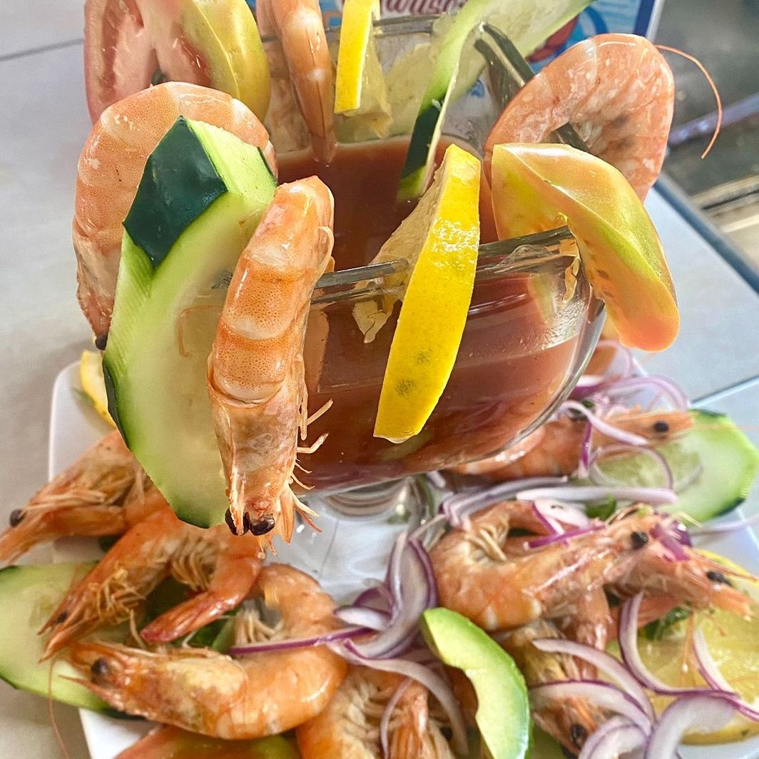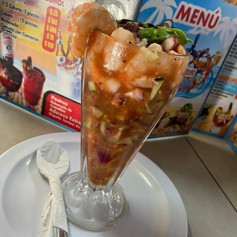 Camarón cocido, pulpo, cebolla, tomate y pepino. Acompañado con tostadas, saladitas, catsup, mayonesa y chile.