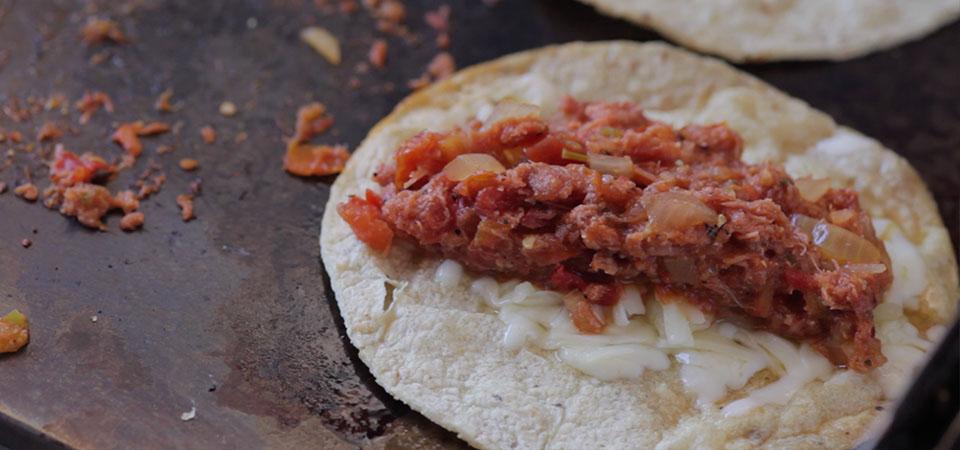 Taco de Marlin guisado con tomate, cebolla y poblano.