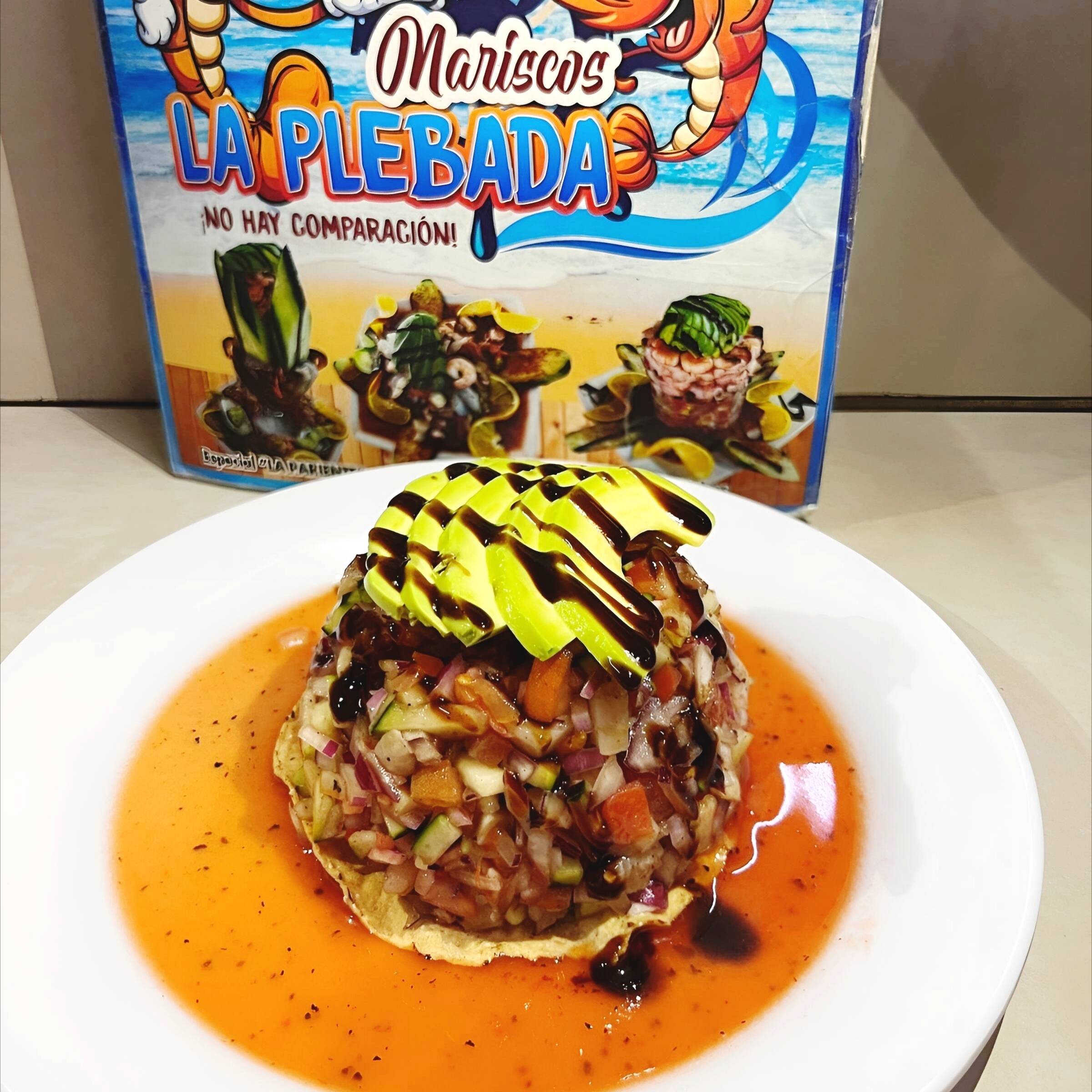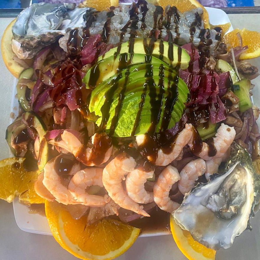 Ceviche pez, ceviche camarón, pulpo, calamar, camarón crudo y cocido, medallón de atún y 3 ostiones. Acompañado con tostadas, saladitas, catsup, mayonesa y chile