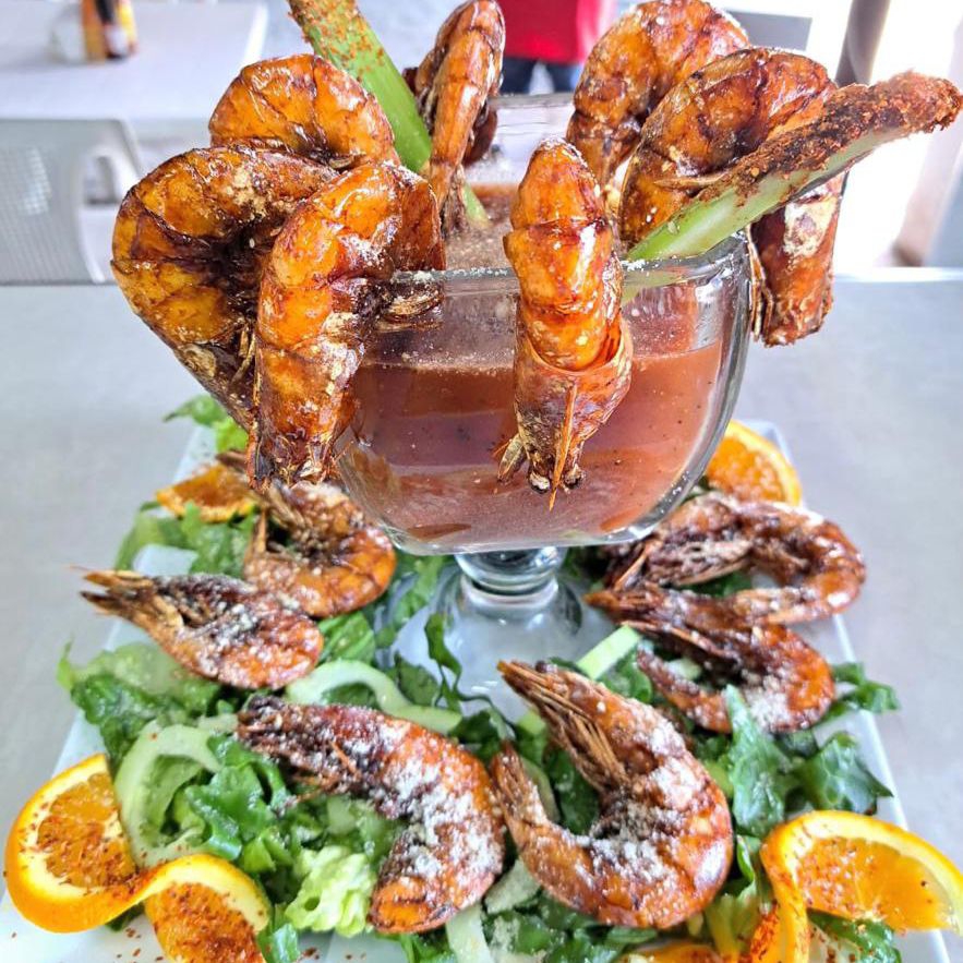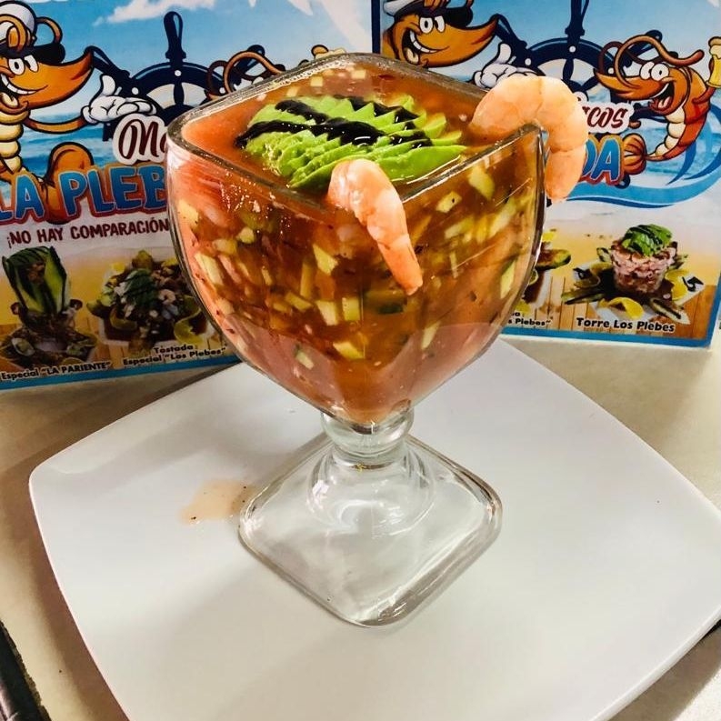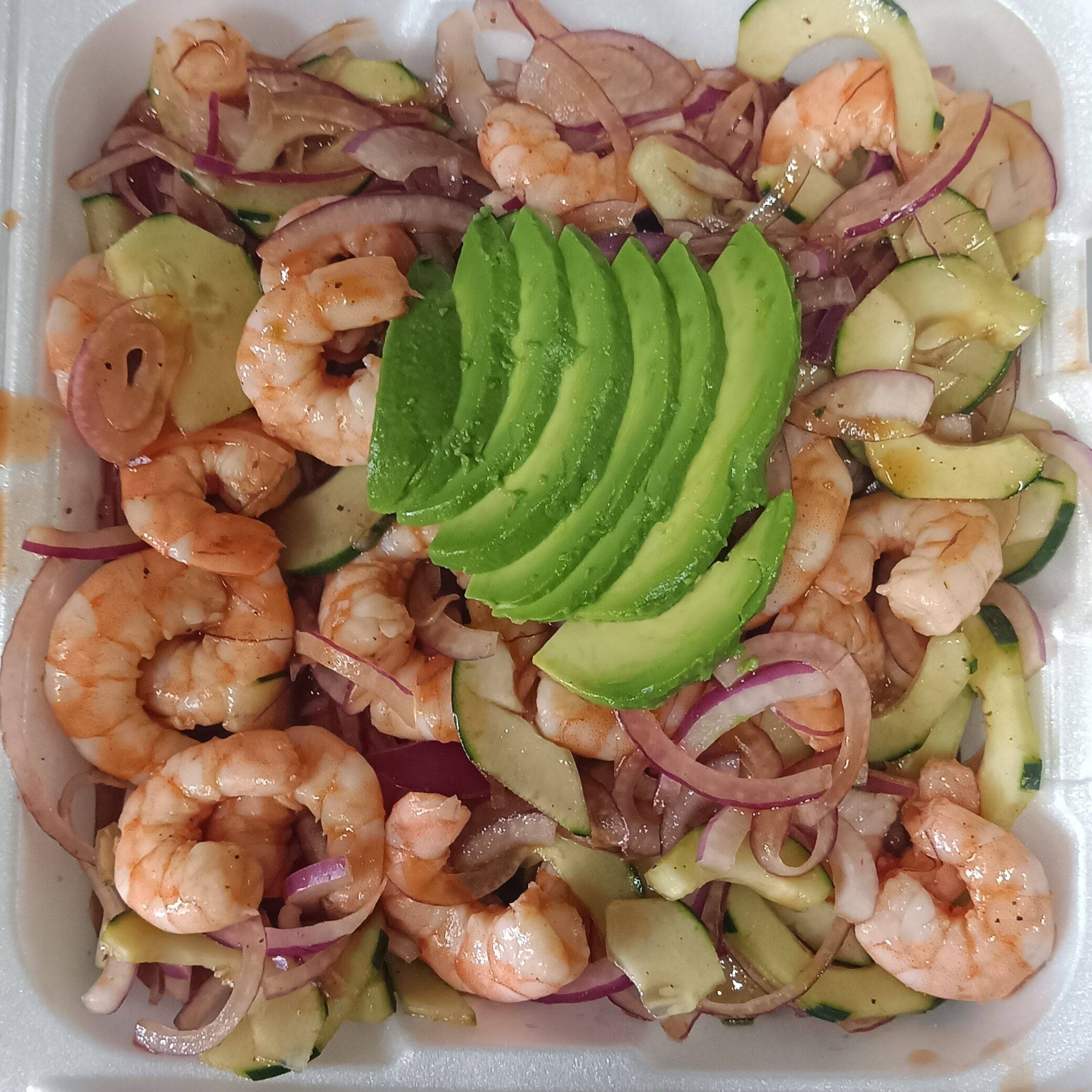 Camarones cocidos con cabeza y cáscara acompañados con pepino, cebolla, lechuga y un preparado especial. Incluye tostadas, galletas, mayonesa y chile