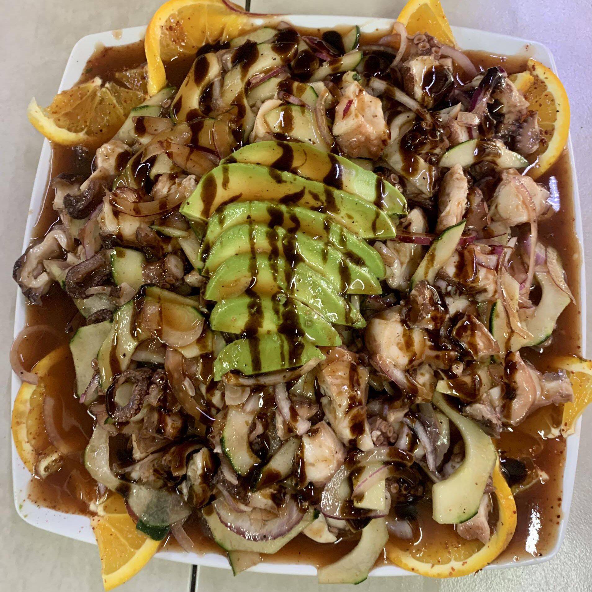 Pulpo con cebolla y pepino, acompañado con un preparado de la casa. Incluye tostadas, galletas, catsup, mayonesa y chile