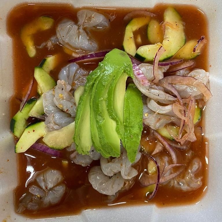 Ceviche de camarón curtido con limón, cebolla, tomate y pepino. Incluye tostadas, galletas, catsup, mayonesa y chile